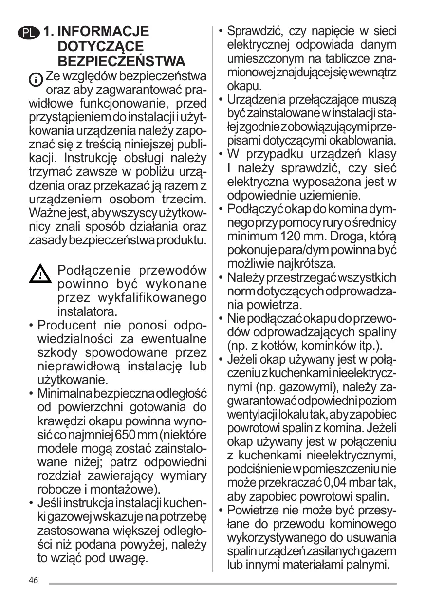 Para los aparatos de la clase I, compruebe que el suministro de corriente eléctrica de la casa tiene una conexión a tierra adecuada. Conecte la campana a la chimenea con un tubo de un diámetro mínimo de 120 mm. El trayecto de humos debe ser lo más corto posible. Deben observarse todas las normas relativas al escape de aire. No conecte la campana extractora a los conductos de humos de combustión (p. ej. calderas, chimeneas, etc.). Si la campana se utiliza en combinación con equipos no eléctricos (por ejemplo, aparatos de gas), debe asegurarse un grado suficiente de ventilación en el local para evitar el retorno del flujo de gases de escape. Cuando la campana extractora se utiliza en combinación con aparatos no eléctricos, la presión negativa en el local no debe ser superior a 0,04 mbar para evitar que los humos vuelvan al local a través de la campana extractora. El aire no debe descargarse a través de un conducto utilizado para los gases de combustión procedentes de aparatos de combustión de gas u otros combustibles. Si el cable de alimentación está dañado, debe ser reemplazado 21