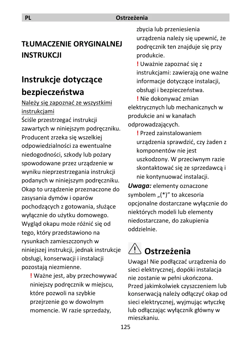 La hotte peut avoir des caractéristiques esthétiques différentes par rapport aux dessins de ce mode d’emploi. Les instructions pour l’utilisation, l'entretien et l’installation restent quoi qu’il en soit les mêmes. ! il est important de conserver ce manuel pour pouvoir le consulter à tout moment. En cas de vente, de cession ou de déménagement, s'assurer qu’il accompagne le produit. ! Lisez les instructions attentivement : il y a