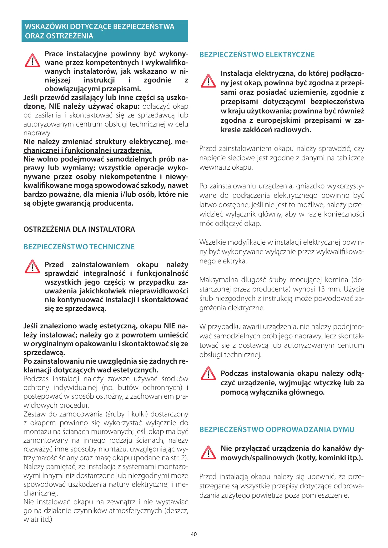 Avant d’effectuer l'installation de la hotte, lire attentivement le chap. « CONSIGNES DE SÉCURITÉ ET MISES EN GARDE ».