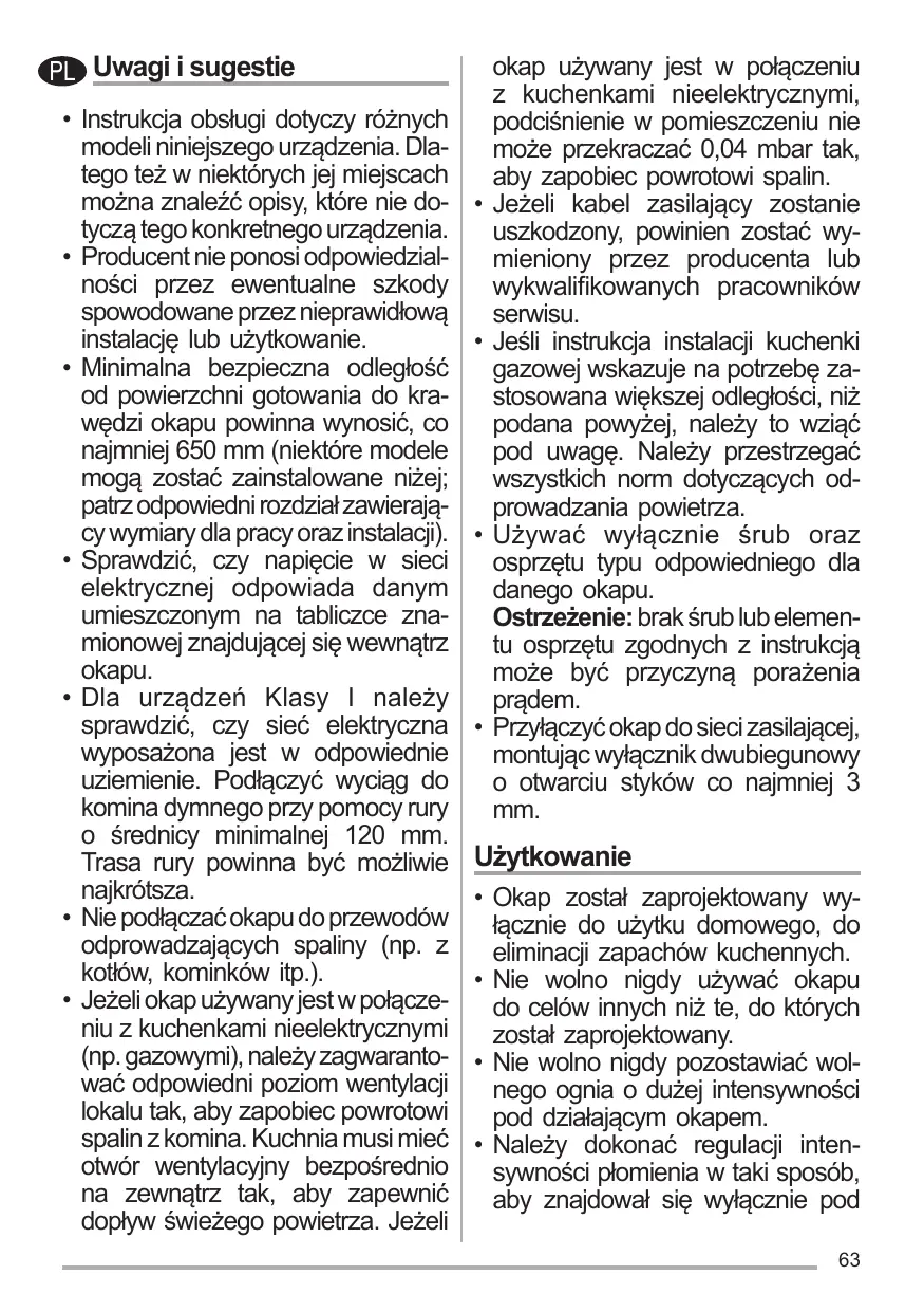 Jezeli okap uzywany jest w potacze- niu z kuchenkami nieelektrycznymi (np. gazowymi), nalezy zagwaranto- waé odpowiedni poziom wentylacji lokalu tak, aby zapobiec powrotowi spalin zkomina. Kuchnia musi mieé otwér wentylacyjny bezpo$rednio na zewnatrz tak, aby zapewnié doptyw $wieZego powietrza. Jezeli