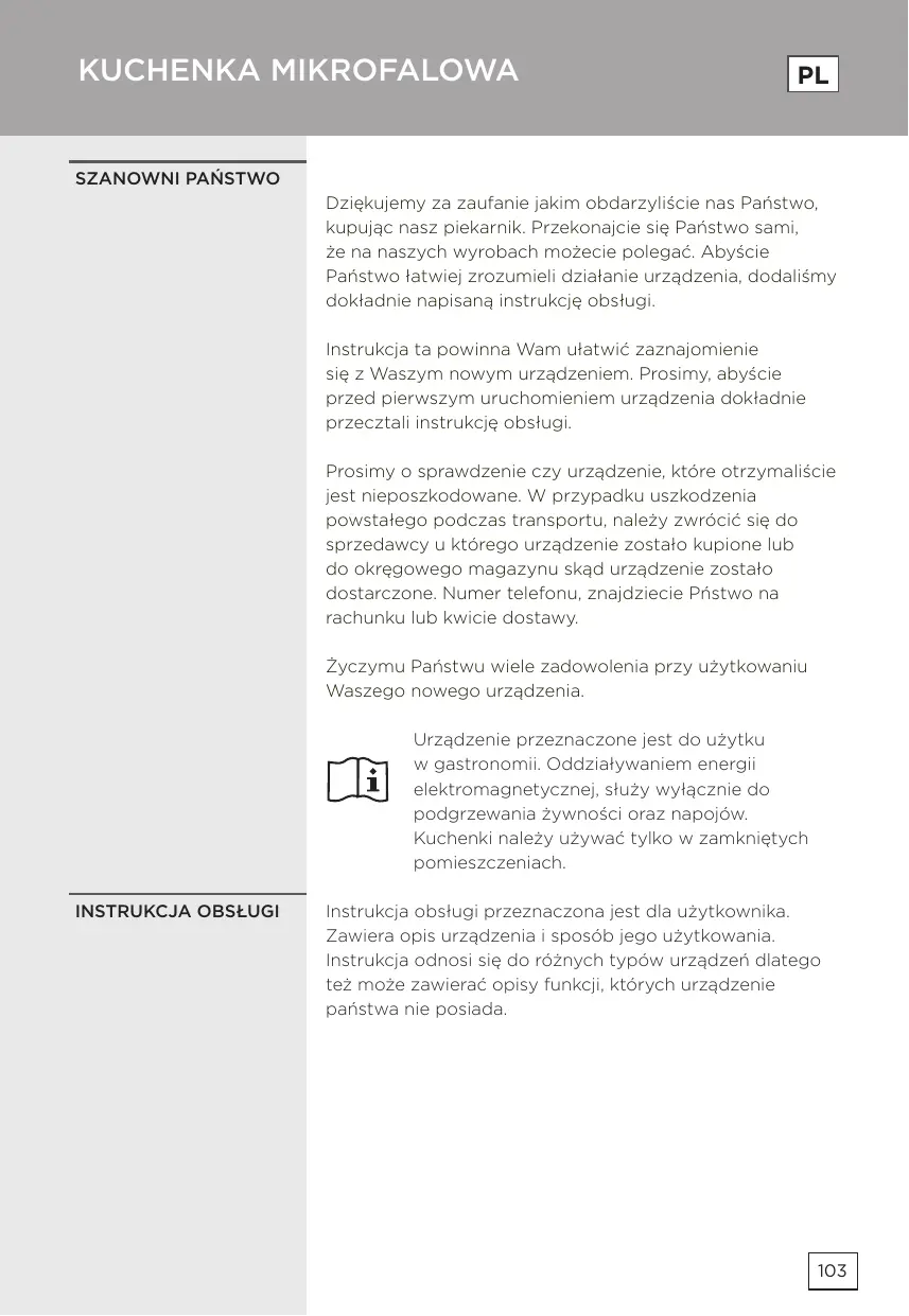 Dziękujemy za zaufanie jakim obdarzyliście nas Państwo, kupując nasz piekarnik. Przekonajcie się Państwo sami, że na naszych wyrobach możecie polegać. Abyście Państwo łatwiej zrozumieli działanie urządzenia, dodaliśmy dokładnie napisaną instrukcję obsługi. Instrukcja ta powinna Wam ułatwić zaznajomienie się z Waszym nowym urządzeniem. Prosimy, abyście przed pierwszym uruchomieniem urządzenia dokładnie przecztali instrukcję obsługi. Prosimy o sprawdzenie czy urządzenie, które otrzymaliście jest nieposzkodowane. W przypadku uszkodzenia powstałego podczas transportu, należy zwrócić się do sprzedawcy u którego urządzenie zostało kupione lub do okręgowego magazynu skąd urządzenie zostało dostarczone. Numer telefonu, znajdziecie Pństwo na rachunku lub kwicie dostawy. Życzymu Państwu wiele zadowolenia przy użytkowaniu Waszego nowego urządzenia. Urządzenie przeznaczone jest do użytku w gastronomii. Oddziaływaniem energii elektromagnetycznej, służy wyłącznie do podgrzewania żywności oraz napojów. Kuchenki należy używać tylko w zamkniętych pomieszczeniach.