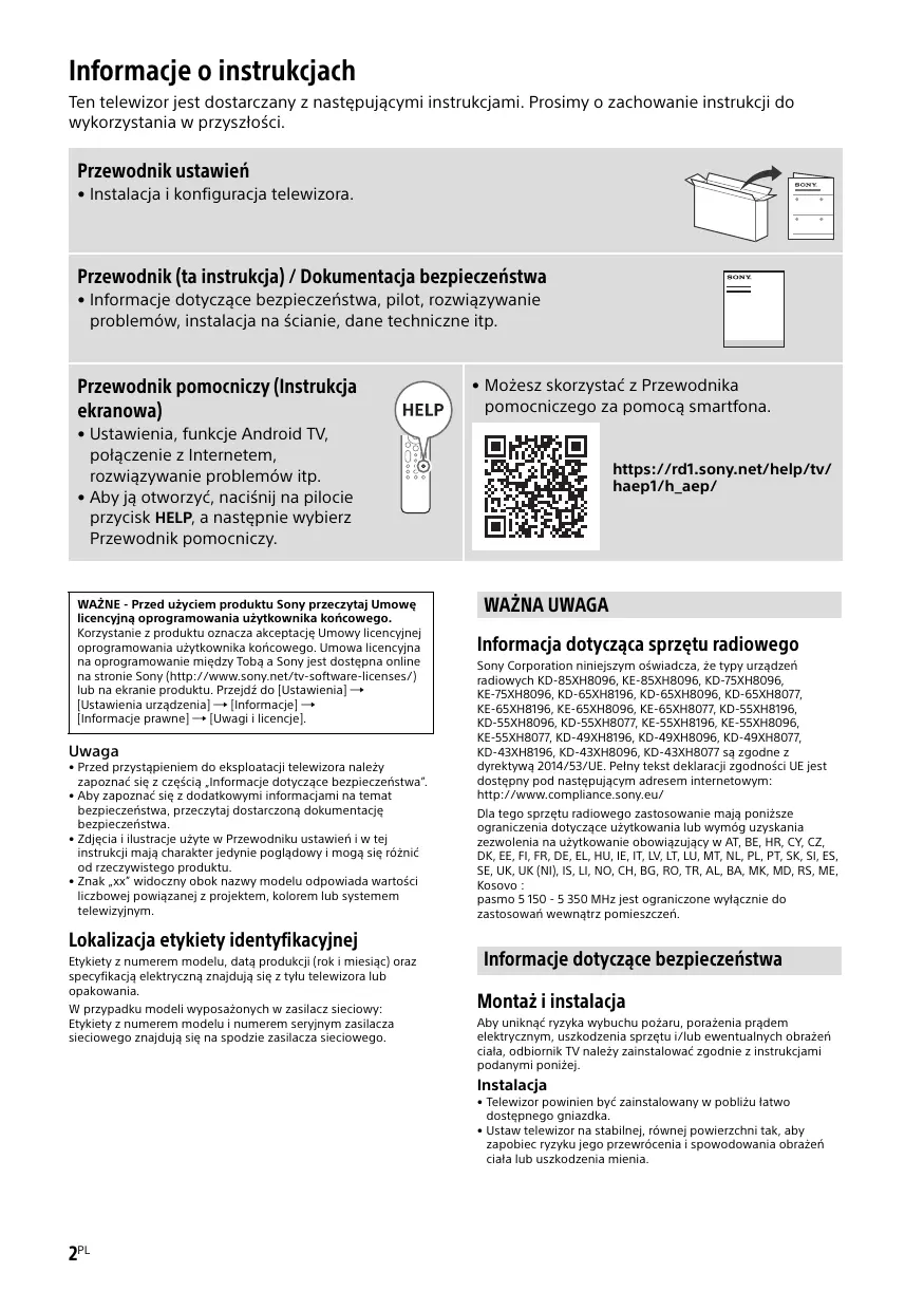 Informacja dotycząca sprzętu radiowego Sony Corporation niniejszym oświadcza, że typy urządzeń radiowych KD-85XH8096, KE-85XH8096, KD-75XH8096, KE-75XH8096, KD-65XH8196, KD-65XH8096, KD-65XH8077, KE-65XH8196, KE-65XH8096, KE-65XH8077, KD-55XH8196, KD-55XH8096, KD-55XH8077, KE-55XH8196, KE-55XH8096, KE-55XH8077, KD-49XH8196, KD-49XH8096, KD-49XH8077, KD-43XH8196, KD-43XH8096, KD-43XH8077 są zgodne z dyrektywą 2014/53/UE. Pełny tekst deklaracji zgodności UE jest dostępny pod następującym adresem internetowym: http://www.compliance.sony.eu/ Dla tego sprzętu radiowego zastosowanie mają poniższe ograniczenia dotyczące użytkowania lub wymóg uzyskania zezwolenia na użytkowanie obowiązujący w AT, BE, HR, CY, CZ, DK, EE, FI, FR, DE, EL, HU, IE, IT, LV, LT, LU, MT, NL, PL, PT, SK, SI, ES, SE, UK, UK (NI), IS, LI, NO, CH, BG, RO, TR, AL, BA, MK, MD, RS, ME, Kosovo : pasmo 5 150 - 5 350 MHz jest ograniczone wyłącznie do zastosowań wewnątrz pomieszczeń. Lokalizacja etykiety identyfikacyjnej Etykiety z numerem modelu, datą produkcji (rok i miesiąc) oraz specyfikacją elektryczną znajdują się z tyłu telewizora lub opakowania. W przypadku modeli wyposażonych w zasilacz sieciowy: Etykiety z numerem modelu i numerem seryjnym zasilacza sieciowego znajdują się na spodzie zasilacza sieciowego. Informacje dotyczące bezpieczeństwa Montaż i instalacja Aby uniknąć ryzyka wybuchu pożaru, porażenia prądem elektrycznym, uszkodzenia sprzętu i/lub ewentualnych obrażeń ciała, odbiornik TV należy zainstalować zgodnie z instrukcjami podanymi poniżej. Instalacja