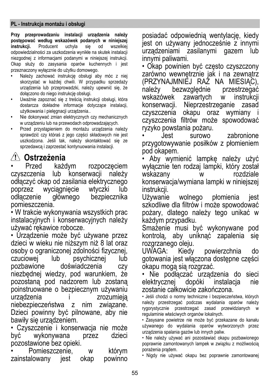 - Okap powinien byc czego czyszczony zarowy wewétrznie jak i na zewnatrz (PRZYNAJMNIÉJ RAZ NA MIESIÁC), naleź bezwzgliednie przyestrzegać wskazówek zawartych w instrukcj konserwacje. Nieprzestrzeganie zasad czyszczenia okapu oraz wymianicy czyszczenia filtrówMZE spowodac ryzykogowstania pożaru.