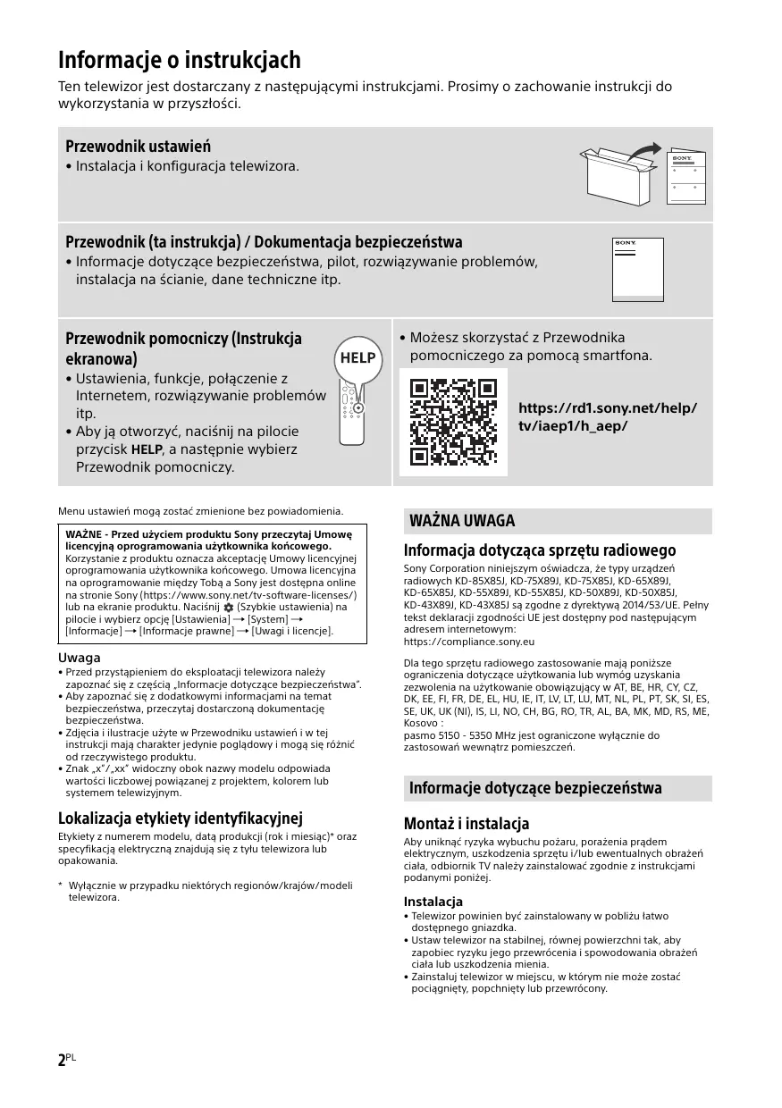 KD-55X85J - KD-65X85J - KD-75X85J - KD85X85J - Telewizor SONY - Bezpłatna instrukcja obsługi
