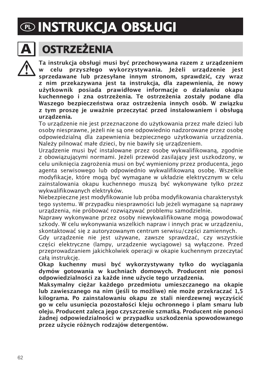 La notice a été rédigée pour votre sécurité et celle d’autrui. Nous vous prions donc de la lire attentivement avant de monter et d’utiliser l’appareil. Les enfants ou les handicapés ne doivent se servir de l’appareil que sous la surveillance d’une personne responsable pouvant s’assurer qu’ils l’utilisent en toute sécurité. Veiller à ce que les enfants ne jouent pas avec l’appareil. L’appareil doit être monté par un installateur compétent et qualifié, conformément aux normes en vigueur. Si le câble d’alimentation est abîmé, demander au fabricant, à un Service après-vente agréé ou à une personne expérimentée de le remplacer afin de prévenir tout risque de danger. Les modifications éventuelles de l’installation électrique, qui s’avèrent nécessaires pour monter la hotte, doivent être faites par du personnel compétent. Il est dangereux de modifier ou d’essayer de modifier les caractéristiques de cette installation. En cas de panne ou de mauvais fonctionnement de l’appareil, ne pas essayer de résoudre le problème mais s’adresser au Service après-vente agréé. Les réparations faites par des personnes non compétentes peuvent abîmer l’appareil. Pour toute intervention, s’adresser à un Service après-vente agréé en mesure de fournir les pièces détachées. Toujours vérifier si les parties électriques, (lumières, aspirateur) sont éteintes quand l’appareil n’est pas utilisé. Lire entièrement la notice avant d’effectuer une opération quelconque sur la hotte. La hotte s’utilise de la même façon que les aspirateurs des fumées de cuisson au-dessus des cuisinières domestiques. Le fabricant décline toute responsabilité en cas d’usage impropre. Le poids maximal des objets éventuels placés ou suspendus (quand c’est prévu) sur la hotte ne doit pas dépasser 1,5 kg. Après avoir monté la hotte en acier inox, la nettoyer pour éliminer les résidus de colle ou de produit de protection et les taches de graisse ou d’huile. Pour exécuter cette opération, le constructeur recommande l’utilisation des lingettes détergentes fournies avec la lampe. Le fabricant décline toute responsabilité pour les dommages éventuels en cas d’emploi d’autres types de détergents.