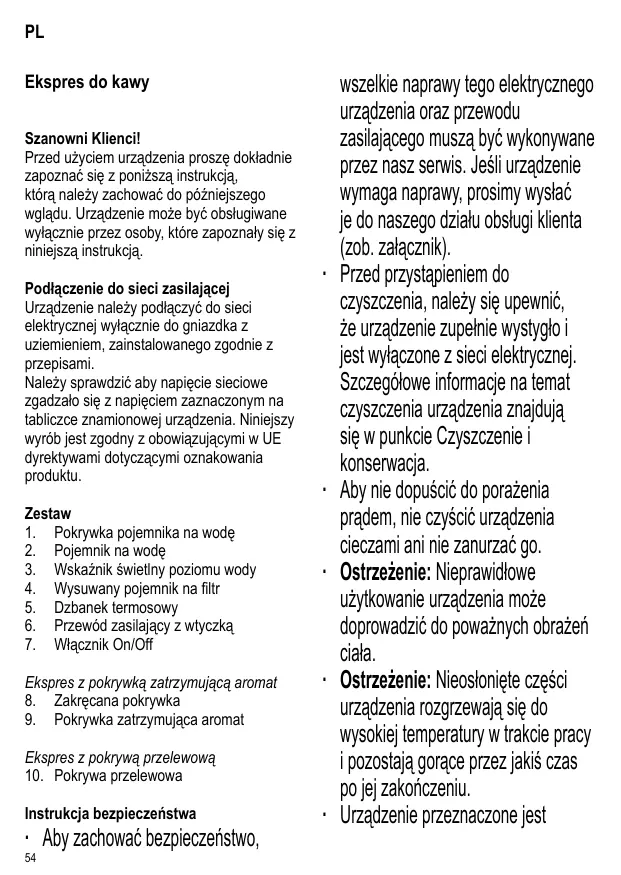 wszelkie naprawy tego elektrycznego urządzenia oraz przewodu zasilającego muszą być wykonywane przez nasz serwis. Jeśli urządzenie wymaga naprawy, prosimy wysłać je do naszego działu obsługi klienta (zob. załącznik). Przed przystąpieniem do czyszczenia, należy się upewnić, że urządzenie zupełnie wystygło i jest wyłączone z sieci elektrycznej. Szczegółowe informacje na temat czyszczenia urządzenia znajdują się w punkcie Czyszczenie i konserwacja. Aby nie dopuścić do porażenia prądem, nie czyścić urządzenia cieczami ani nie zanurzać go. Ostrzeżenie: Nieprawidłowe użytkowanie urządzenia może doprowadzić do poważnych obrażeń ciała. Ostrzeżenie: Nieosłonięte części urządzenia rozgrzewają się do wysokiej temperatury w trakcie pracy i pozostają gorące przez jakiś czas po jej zakończeniu. Urządzenie przeznaczone jest do zastosowań domowych lub podobnych, jak np. w - kuchniach biurowych lub innych miejscach pracy; - agroturystyce; - hotelach, motelach itp. oraz innych podobnych lokalach (przez klientów); - pensjonatach. ∙ Osoby o ograniczonych zdolnościach fizycznych, czuciowych lub psychicznych albo nieposiadające stosownego doświadczenia lub wiedzy, a także dzieci (w wieku co najmniej 8 lat), mogą korzystać z urządzenia, pod warunkiem że znajdują się pod nadzorem lub zostały poinstruowane, jak używać urządzenia i są w pełni świadome wszelkich zagrożeń i wymaganych środków ostrożności. ∙ Nie dopuszczać do używania urządzenia jako zabawki przez dzieci. ∙ Nie wolno pozwalać dzieciom na wykonywanie jakichkolwiek prac związanych bezpośrednio z konserwacją lub czyszczeniem urządzenia, a jeżeli już, to dziecko musi mieć co najmniej 8 lat i być nadzorowane przez osobę dorosłą. ∙ Nie dopuszczać do urządzenia i jego przewodu zasilającego dzieci poniżej 8 lat. ∙ Ostrzeżenie: Nie pozwalać, aby dzieci miały dostęp do elementów opakowania, ponieważ mogą one spowodować zagrożenie, np. uduszenia. ∙ Przed użyciem należy dokładnie sprawdzić, czy główny korpus urządzenia i wszystkie elementy czynnościowe są sprawne i nie noszą śladów uszkodzenia. Jeżeli urządzenie np. spadło na twardą powierzchnię albo przewód zasilający został narażony na zbyt silne szarpnięcie, nie nadaje się ono do dalszego użytku: nawet najmniejsza, niewidoczna usterka powstała z tego powodu, może mieć ujemny wpływ na działanie urządzenia i bezpieczeństwo użytkownika. ∙ Podczas parzenia kawy, urządzenie musi być ustawione na równej i nie śliskiej powierzchni, odpornej na ewentualne zaplamienie i rozpryski. ∙ Urządzenie oraz przewód sieciowy nie mogą stykać się z gorącymi powierzchniami, ani też być poddawane działaniu wysokich temperatur. ∙ Przed otwieraniem ekspresu lub wyjmowaniem z niego jakichkolwiek elementów czynnościowych i akcesoriów, należy urządzenia wyłączyć i poczekać na jego ochłodzenie. W ten sposób można zapobiec niebezpieczeństwu wydzielania się pary lub gorącej wody. ∙ Dzieci powinny znajdować się pod stałą opieką, aby nie dopuścić do używania