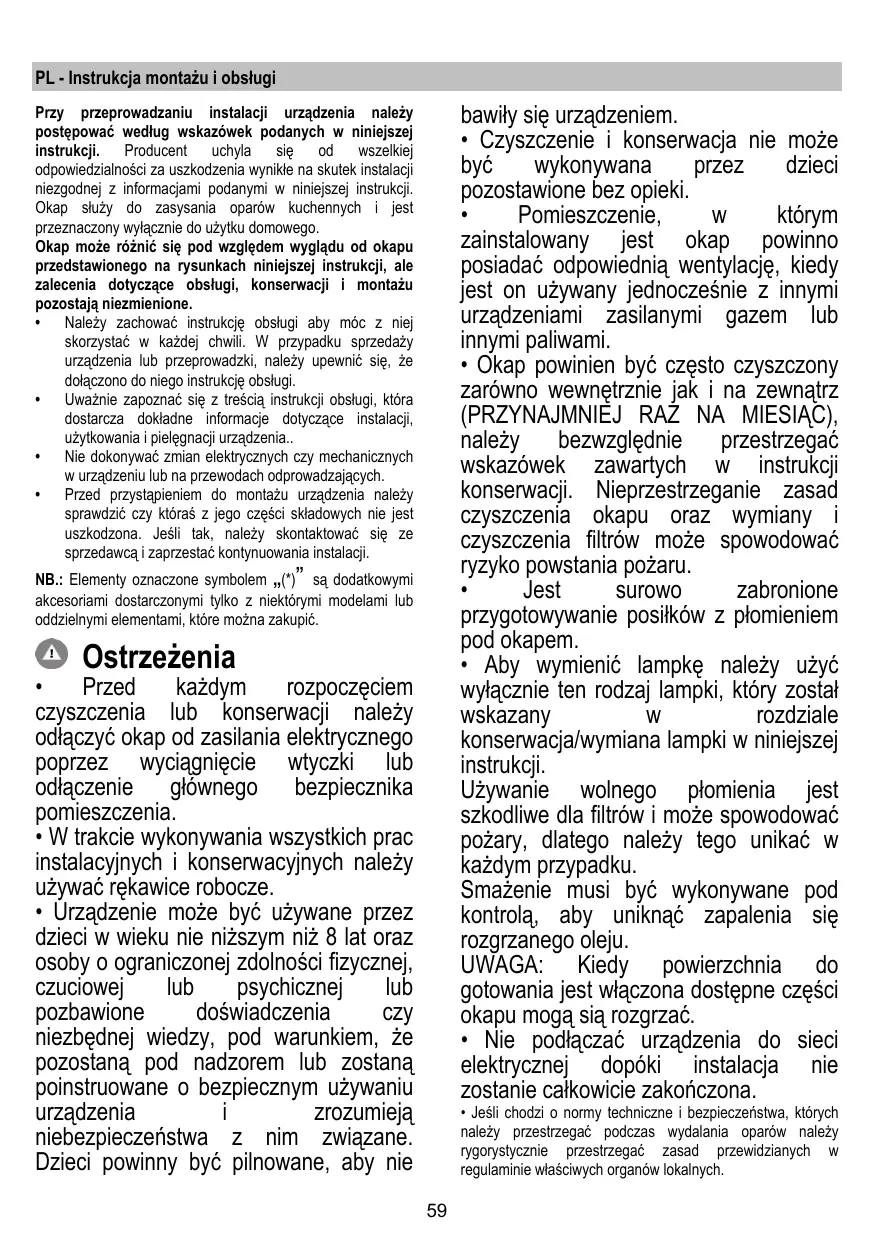 - Nie podłączać urządzenia do sieci elektrycznej dopóki instalacja nie zostanie całkowicie zakończona. Przy przeprowadzaniu instalacji urządzenia należy postępować według wskazówek podanych w niniejszej instrukcji. Producent uchyla się od wszelkiej odpowiedzialności za uszkodzenia wynikłe na skutek instalacji niezgodnej z informacjami podanymi w niniejszej instrukcji. Okap służy do zasysania oparów kuchennych i jest przeznaczony wyłącznie do użytku domowego. Okap może różnić się pod względem wyglądu od okapu przedstawionego na rysunkach niniejszej instrukcji, ale zalecenia dotyczące obsługi, konserwacji i montażu pozostają niezmienione.