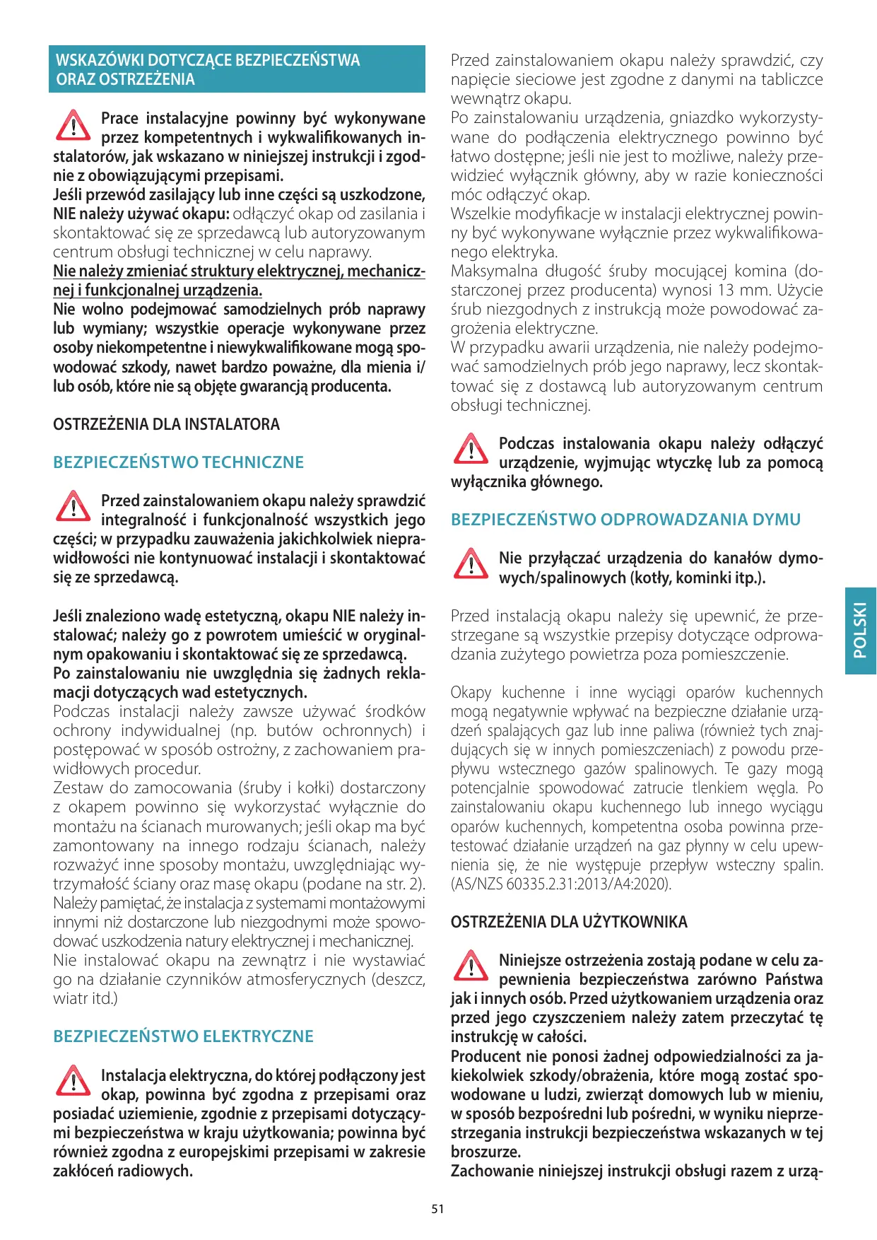 (y compris ceux qui se trouvent dans d’autres pièces) en raison du reflux des gaz de combustion. Ces gaz peuvent potentiellement entraîner une intoxication au monoxyde de carbone. Après l’installation d’une hotte de cuisine ou d’un autre aspirateur des fumées de cuisson, le fonctionnement des appareils à gaz canalisé doit être testé par une personne compétente pour vérifier l’absence de reflux des gaz de combustion. (AS/NZS 60335.2.31:2013/A4:2020). MISES EN GARDE POUR L'UTILISATEUR Ces mises en garde ont été rédigées pour votre sécurité et pour celle d'autrui, nous vous prions donc de lire attentivement toutes les parties de ce manuel avant d'utiliser l'appareil ou de le nettoyer. Le fabricant décline toute responsabilité pour d’éventuels dommages, directs ou indirects, pouvant être causés aux personnes, aux choses et aux animaux domestiques, suite au non-respect des mises en garde de sécurité indiquées dans ce manuel. Il est très important que ce manuel d'instructions soit conservé avec l'appareil pour toute consultation future.