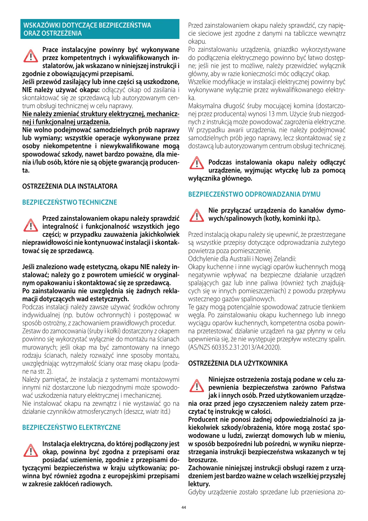 Divergencia normativa para Australia y Nueva Zelanda: Las campanas extractoras y otros extractores de humos de cocina pueden afectar negativamente al funcionamiento seguro de los aparatos que queman gas u otros combustibles (incluidos los que se encuentran en otras habitaciones) debido al reflujo de los gases de combustión. Dichos gases pueden, potencialmente, derivar en intoxicación por monóxido de carbono. Tras la instalación de una campana extractora u otro extractor de humos de cocina, una persona competente debe probar el funcionamiento de los aparatos de gas de combustión para cerciorarse de que no se produzca el reflujo de los mismos. (AS/NZS 60335.2.31:2013/A4:2020). No realice operaciones de limpieza con las partes de la campana aún calientes. Si no se realiza la limpieza según las modalidades y los productos indicados en este manual, esto puede conllevar un riesgo de incendio. Desconecte el interruptor general, si no va a usar el equipo durante un periodo de tiempo prolongado. En caso de utilizar simultáneamente otros equipos (calderas, estufas, hogares, etc.) alimentados con gas o con otros combustibles, prevea una adecuada ventilación del ambiente donde se realiza la aspiración de humos, según las normas vigentes.