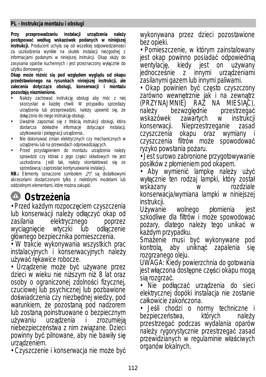 Cet appareil est destiné à être utilisé dans des applications domestiques et analogues telles que : - des coins cuisines réservés au personnel dans des magasins, bureaux et autres environnements professionnels ; - des fermes ; - l’utilisation par les clients des hôtels, motels et autres environnements à caractère résidentiel ; - des environnements du type chambre d’hôtes. La hotte peut avoir des configurations esthétiques différentes par rapport à ce qui est illustré dans les dessins de ce manuel, cependant les instructions pour l’utilisation, l’entretien et l’installation restent identiques. • Il est important de conserver ce livret pour pouvoir le consulter à tout moment. En cas de vente, de cession ou de déménagement, assurez-vous que la notice d'utilisation l'accompagne. • Veuillez lire attentivement les instructions, vous trouverez des informations importantes sur l'installation, le mode d'emploi et la sécurité. • Ne pas effectuer des modifications électriques ou mécaniques sur le produit ou sur les conduits d’évacuation. • Avant d'installer l'appareil, vérifiez qu’il n’y a aucun composant endommagé. Sinon, contactez votre revendeur et ne continuez pas l'installation. Remarque : Les pièces marquées du symbole « (*) » sont des accessoires en option fournis uniquement avec certains modèles, ou des pièces non fournies, à acheter.