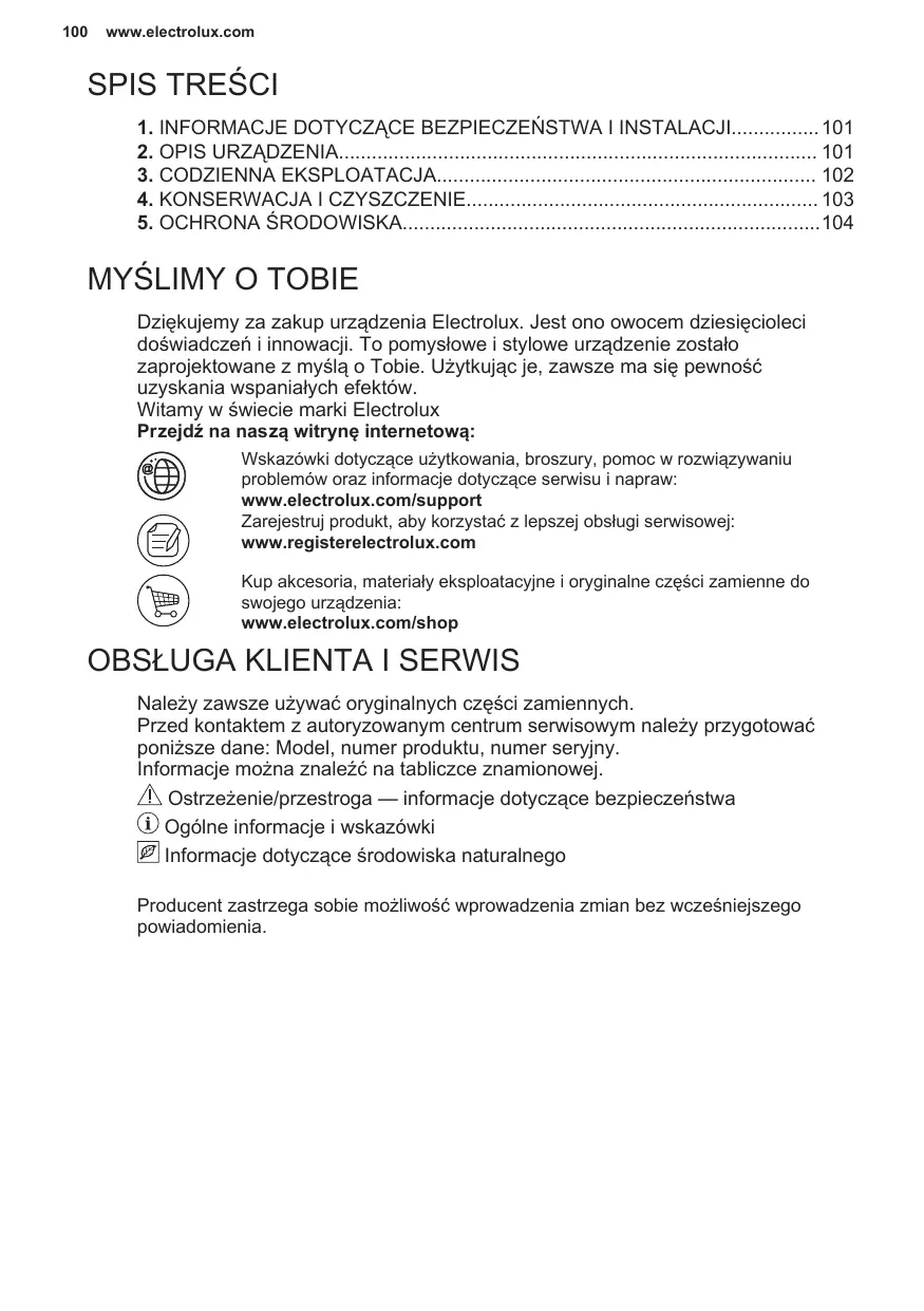 Dziękujemy za zakup urządzenia Electrolux. Jest ono owocem dziesięcioleci doświadczeń i innowacji. To pomysłowe i stylowe urządzenie zostało zaprojektowane z myślą o Tobie. Użytkując je, zawsze ma się pewność uzyskania wspaniałych efektów. Witamy w świecie marki Electrolux Przejdź na naszą witrynę internetową: Wskazówki dotyczące użytkowania, broszury, pomoc w rozwiązywaniu problemów oraz informacje dotyczące serwisu i napraw: www.electrolux.com/support Zarejestruj produkt, aby korzystać z lepszej obsługi serwisowej: www.registerelectrolux.com Kup akcesoria, materiały eksploatacyjne i oryginalne części zamienne do swojego urządzenia: www.electrolux.com/shop
