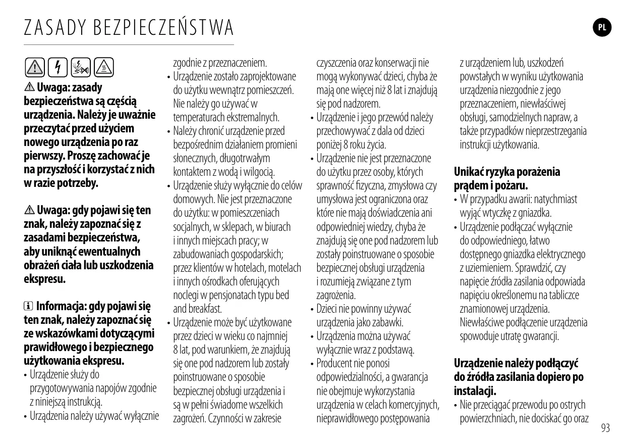 ZASADY BEZPIECZEŃSTWA Uwaga: zasady bezpieczeństwa są częścią urządzenia. Należy je uważnie przeczytać przed użyciem nowego urządzenia po raz pierwszy. Proszę zachować je na przyszłość i korzystać z nich w razie potrzeby. Uwaga: gdy pojawi się ten znak, należy zapoznać się z zasadami bezpieczeństwa, aby uniknąć ewentualnych obrażeń ciała lub uszkodzenia ekspresu. Informacja: gdy pojawi się ten znak, należy zapoznać się ze wskazówkami dotyczącymi prawidłowego i bezpiecznego użytkowania ekspresu. • Urządzenie służy do przygotowywania napojów zgodnie z niniejszą instrukcją. • Urządzenia należy używać wyłącznie