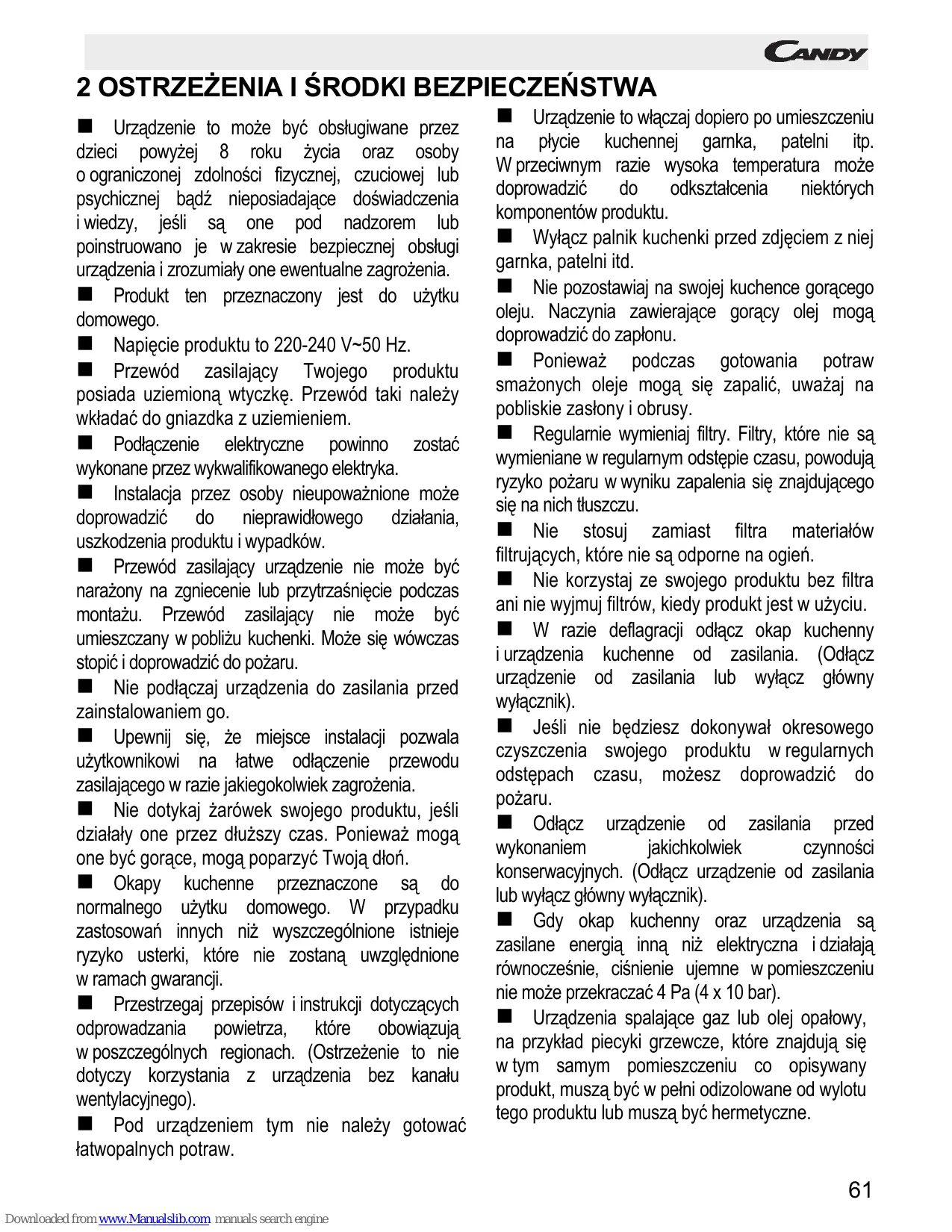 CBT9240X - Okap kuchenny CANDY - Bezpłatna instrukcja obsługi