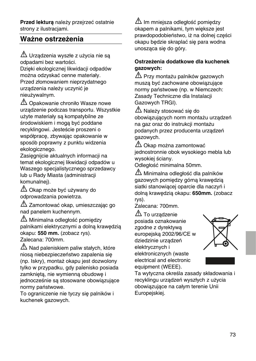Remarques supplémentaires concernant le cuisinières à gaz: Lors du montage de foyers gaz, veuillez respecter les dispositions légales en vigueur dans votre pays (en Allemagne par example: les Règles techniques TRGI régissant l‘installation du gaz). Respectez les prescriptions et consignes d’encastrement en leur version applicable, publiées par les fabricants d’appareils au gaz. La hotte aspirante ne pourra cotoyer que sur un côté un meuble haut ou une paroi haute. Ecart minimum: 50 mm. Ecart minimum, en présence de foyers au gaz, entre le bord supérieur de la grille support et le bord inférieur de la hotte: 650 mm. (voir figures). Recommandation: 700 mm. Cet appareil est marqué selon la directive européenne 2002/96/CE relative aux appareils Plus l’ecart est faible entre la hotte aspirante et le foyer et plus il se pourra que la vapeur montant des casseroles se 23
