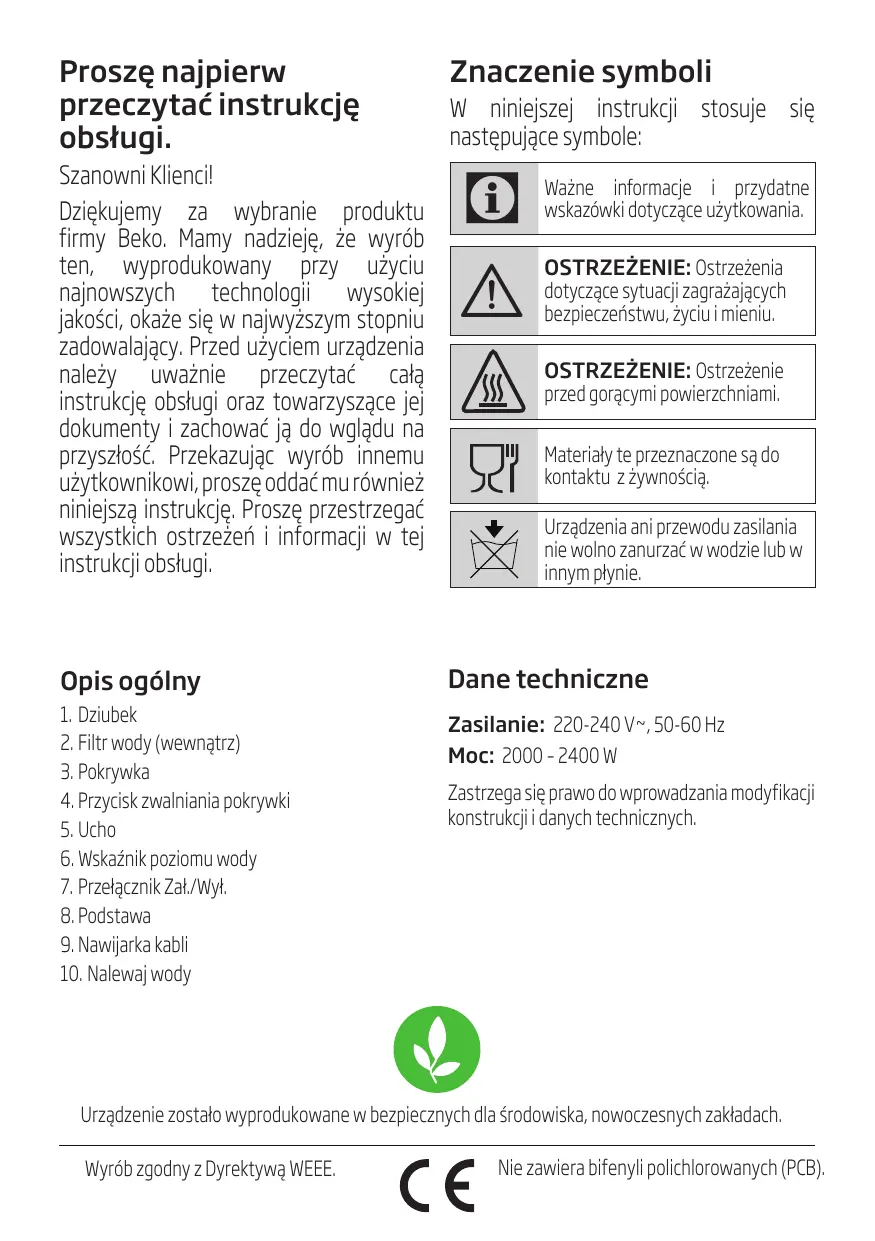 Szanowni Klienci! Dziękujemy za wybranie produktu firmy Beko. Mamy nadzieję, że wyrób ten, wyprodukowany przy użyciu najnowszych technologii wysokiej jakości, okaże się w najwyższym stopniu zadowalający. Przed użyciem urządzenia należy uważnie przeczytać całą instrukcję obsługi oraz towarzyszące jej dokumenty i zachować ją do wglądu na przyszłość. Przekazując wyrób innemu użytkownikowi, proszę oddać mu również niniejszą instrukcję. Proszę przestrzegać wszystkich ostrzeżeń i informacji w tej instrukcji obsługi.