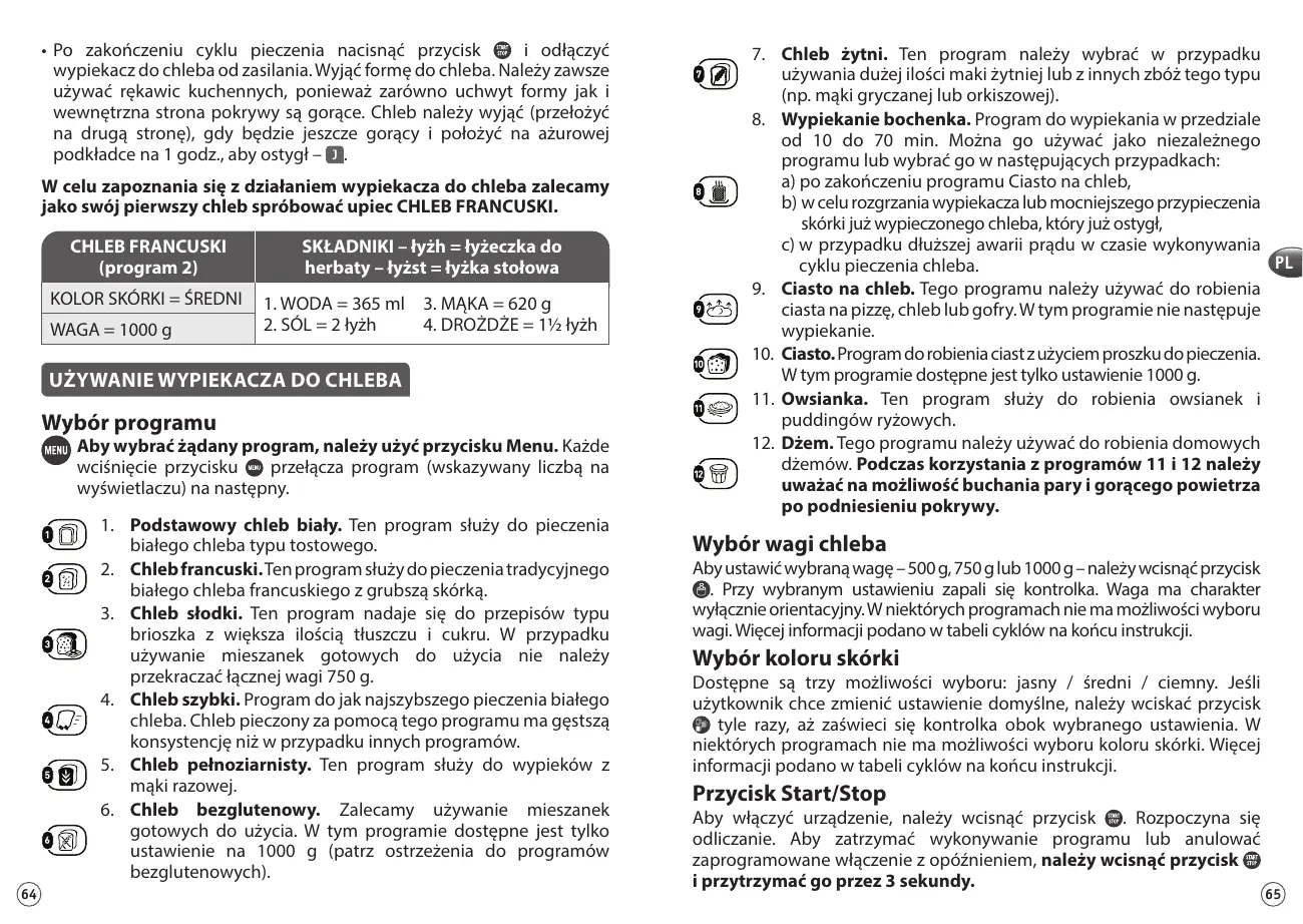 PAIN FRANÇAIS 1. Pain basique. Ce programme permet de réaliser une recette de pain blanc type pain de mie. 2. Pain français. Ce programme permet de réaliser une recette de pain blanc traditionnel français avec une croûte plus épaisse. 3. Pain sucré. Ce programme est adapté aux recettes de type brioche qui contiennent plus de matière grasse et de sucre. Si vous utilisez des préparations prêtes à l’emploi, ne dépassez pas 750 g de pâte au total. 4. Pain rapide. Ce programme permet la réalisation plus rapide de pains blancs. Les pains réalisés avec ce programme ont une texture plus dense que les pains des autres programmes. 5. Pain complet. Ce programme est à sélectionner lorsqu’on utilise de la farine complète. 6. Pain sans gluten. L’utilisation d’un mélange prêt à l’emploi est recommandée. Seul le réglage 1000 g est accessible pour ce programme (voir avertissements pour l’utilisation des programmes sans gluten). 7. Pain au seigle. Ce programme est à sélectionner lorsqu’on utilise une grande quantité de farine de seigle ou d’autres céréales de ce type (ex. sarrasin, épeautre). 8. Cuisson seule. Ce programme permet de cuire de 10 min à 70 min. Il peut être sélectionné seul et être utilisé : a) après le programme Pâtes levées, b) pour réchauffer ou rendre croustillants des pains déjà cuits et refroidis, c) pour finir une cuisson en cas de panne de courant prolongée pendant un cycle de pain. 9. Pâtes Levées. Ce programme permet la réalisation de recettes type pâte à pizza, pâte à pain et pâte à gaufre liégoise. Ce programme ne cuit pas. 10. Gâteau. Permet la confection de gâteaux avec de la levure chimique. Seul le réglage 750 g est accessible pour ce programme.