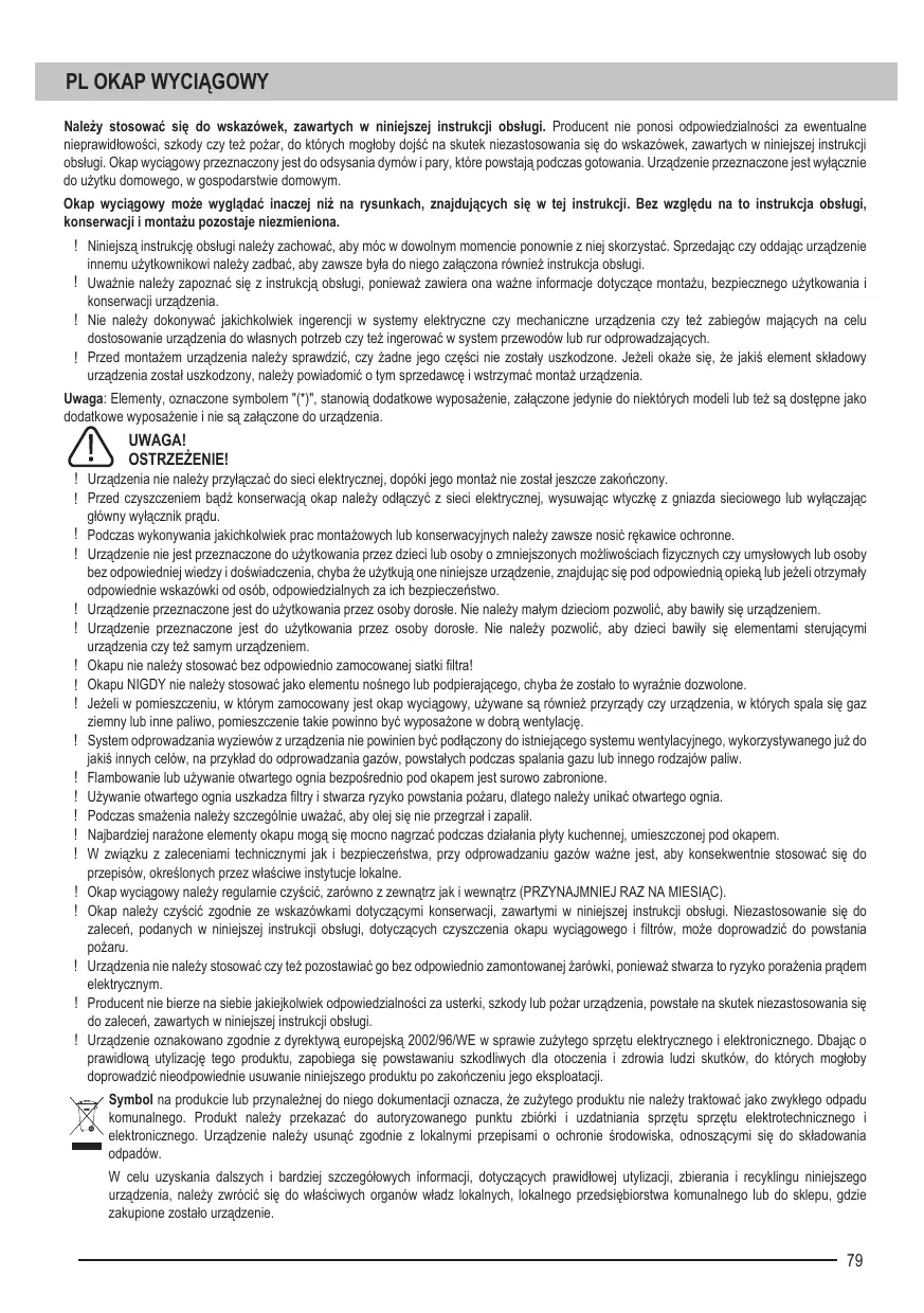 ! ! Cet appareil n’est pas prévu pour les enfants ou les personnes à capacités physiques, sensorielles ou mentales réduites ou manquant d’expérience et de connaissances. Elles ne pourront l’utiliser que sous la surveillance d'un adulte responsable de leur sécurité et après avoir été mises au courant de son fonctionnement. La hotte est prévue pour des adultes. Surveillez les enfants afin qu’ils ne jouent pas avec l’appareil ou avec ses commandes. Ne mettez jamais la hotte en marche si la grille n'est pas bien en place. Ne déposez AUCUN objet sur la hotte sauf si cela est expressément autorisé. Quand la hotte fonctionne en même temps que d'autres appareils à gaz ou autres combustibles, la cuisine doit disposer d'une ventilation suffisante. L'air aspiré par la hotte ne doit jamais être expulsé dans le conduit d’évacuation des fumées de combustion dégagées par des appareils fonctionnant au gaz ou autres combustibles. Il est formellement interdit de flamber les aliments sous la hotte. Évitez de laisser brûler une flamme nue sous la hotte, car cela peut endommager les filtres et provoquer un incendie. Surveillez vos fritures en permanence, car la graisse ou l’huile surchauffée peut prendre feu. Les parties accessibles de la hotte peuvent devenir assez chaudes quand les appareils de cuisson sont en marche. En ce qui concerne les mesures techniques de sécurité pour l'évacuation des fumées, respectez strictement les réglementations et normes en vigueur dans votre pays. La hotte doit être régulièrement nettoyée, aussi bien à l'intérieur qu'à l'extérieur (AU MOINS UNE FOIS PAR MOIS), et ceci en respectant les instructions d'entretien fournies dans ce manuel. Le non-respect des consignes concernant le nettoyage de la hotte ainsi que le remplacement et le nettoyage des filtres peut entraîner un risque d'incendie. Afin d'éviter tout risque de choc électrique, n'utilisez pas la hotte si les lampes ne sont pas bien en place. Nous déclinons toute responsabilité pour tout dysfonctionnement, dommage ou incendie résultant du non-respect des consignes figurant dans cette notice. Ce symbole figure sur le produit ou sur son emballage en application de la directive européenne 2002/96/CE sur les Déchets d’Équipement Électrique et Électronique (DEEE). Cette directive sert de règlement cadre à la reprise, au recyclage et à la valorisation des appareils usagés dans toute l’Europe. Ce produit doit donc faire l’objet d’une collecte sélective. Lorsque vous ne l’utiliserez plus, remettez-le à un service de ramassage spécialisé ou à une déchèterie qui traite les DEEE ; vous contribuerez ainsi à éviter des conséquences néfastes pour la santé et l'environnement. Pour tout renseignement sur la mise au rebut et le recyclage de ce produit, veuillez contacter la mairie ou le service de la propreté de votre commune, ou encore le magasin dans lequel vous l'avez acheté.
