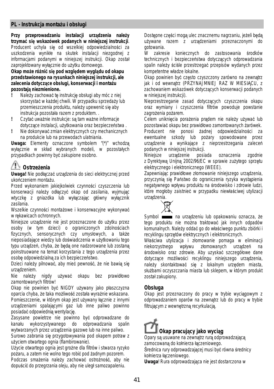 Montaje y modo de empleo Instruções para montagem e utilização ΟΔΗΓΙΕΣ ΣΥΝΑΡΜΟΛΟΓΗΣΗΣ ΚΑΙ ΧΡΗΣΗΣ En ce qui concerne les mesures techniques et de sécurité à adopter pour l’évacuation des fumées, s’en tenir strictement à ce qui est prévu dans les règlements des autorités locales compétentes. La hotte doit être régulièrement nettoyée, aussi bien à l’intérieur qu’à l’extérieur (AU MOINS UNE FOIS PAR MOIS, respecter néanmoins les instructions relatives à l’entretien fournies dans ce manuel). La non observation de ces normes de nettoyage de la hotte et du changement et nettoyage des filtres comporte des risques d’incendie. Ne pas utiliser ou laisser la hotte sans que les ampoules soient correctement placées pour éviter tout risque de choc électrique. La société décline toute responsabilité pour d’éventuels inconvénients, dégâts ou incendies provoqués par l’appareil et dérivés de la non observation des instructions reprises dans ce manuel. Cet appareil porte le symbole du recyclage conformément à la Directive Européenne 2002/96/CE concernant les Déchets d’Équipements Électriques et Électroniques (DEEE ou WEEE). En procédant correctement à la mise au rebut de cet appareil, vous contribuerez à empêcher toute conséquence nuisible pour l’environnement et la santé de l’homme.