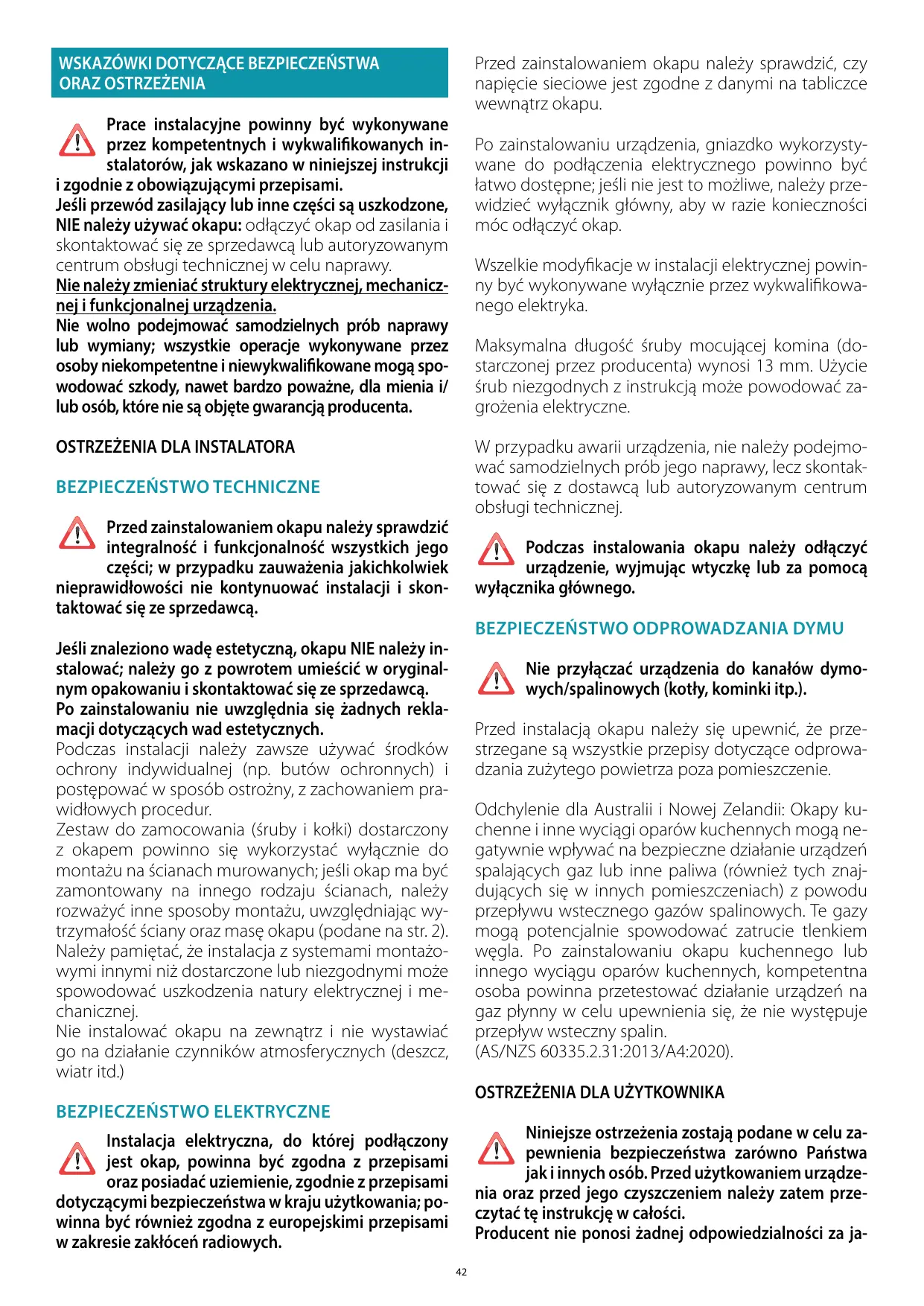 MISES EN GARDE POUR L’INSTALLATEUR SÉCURITÉ TECHNIQUE Avant d'installer la hotte, contrôler l'intégrité et la fonctionnalité de chaque partie : en cas de constatation d'anomalies, ne pas procéder à l'installation et contacter le Revendeur.