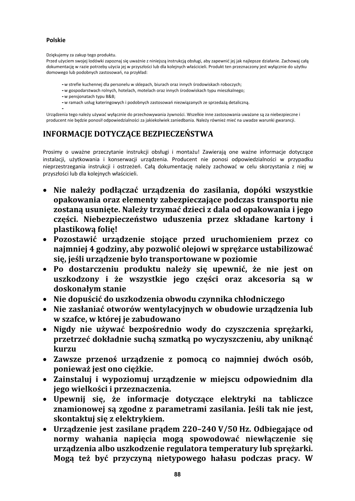 - dans les fermes-auberges, pour la clientèle des hôtels, motels et autres lieux de type résidentiel, - dans les chambres d'hôtes, - chez la restauration et autres services similaires, ce produit ne convient pas à la vente au détail. Cet appareil doit être utilisé uniquement pour conserver de la nourriture ; tout autre usage est considéré comme dangereux et le fabricant ne sera pas tenu responsable en cas de mauvaise utilisation. Il est donc recommandé de prendre connaissance des conditions de garantie.