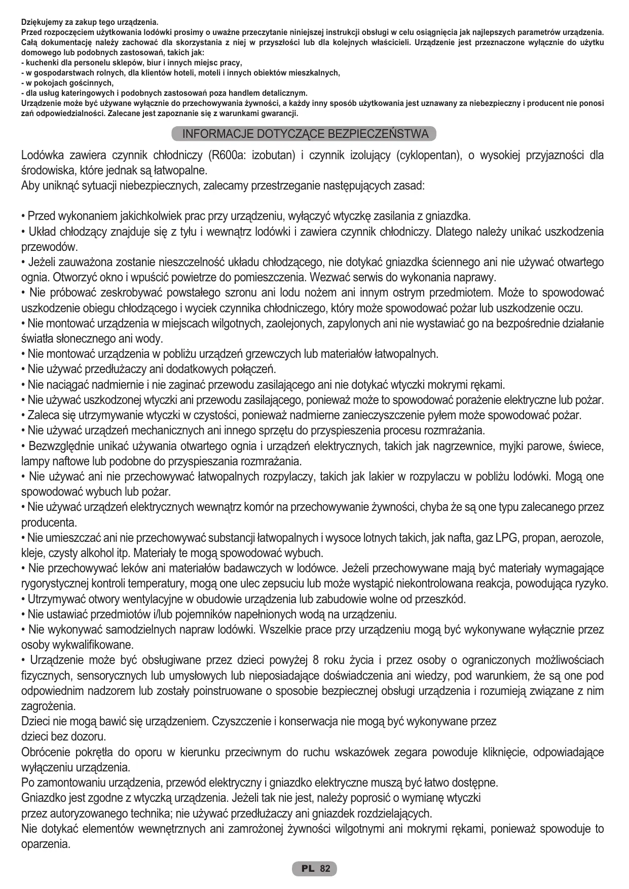 PL 81 Dziękujemy za zakup tego urządzenia. Przed rozpoczęciem użytkowania lodówki prosimy o uważne przeczytanie niniejszej instrukcji obsługi w celu osiągnięcia jak najlepszych parametrów urządzenia. Całą dokumentację należy zachować dla skorzystania z niej w przyszłości lub dla kolejnych właścicieli. Urządzenie jest przeznaczone wyłącznie do użytku domowego lub podobnych zastosowań, takich jak: - kuchenki dla personelu sklepów, biur i innych miejsc pracy, - w gospodarstwach rolnych, dla klientów hoteli, moteli i innych obiektów mieszkalnych, - w pokojach gościnnych, - dla usług kateringowych i podobnych zastosowań poza handlem detalicznym. Urządzenie może być używane wyłącznie do przechowywania żywności, a każdy inny sposób użytkowania jest uznawany za niebezpieczny i producent nie ponosi zań odpowiedzialności. Zalecane jest zapoznanie się z warunkami gwarancji.