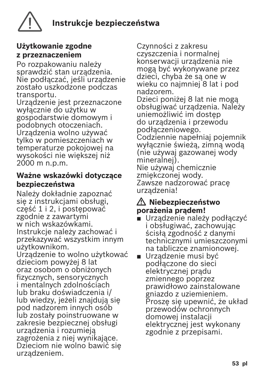 Czynności z zakresu czyszczenia i normalnej konserwacji urządzenia nie mogą być wykonywane przez dzieci, chyba że są one w wieku co najmniej 8 lat i pod nadzorem. Dzieci poniżej 8 lat nie mogą obsługiwać urządzenia. Należy uniemożliwić im dostęp do urządzenia i przewodu podłączeniowego. Codziennie napełniaj pojemnik wyłącznie świeżą, zimną wodą (nie używaj gazowanej wody mineralnej). Nie używaj chemicznie zmiękczonej wody. Zawsze nadzorować pracę urządzenia! W Niebezpieczeństwo porażenia prądem! ■ Urządzenie należy podłączyć i obsługiwać, zachowując ścisłą zgodność z danymi technicznymi umieszczonymi na tabliczce znamionowej. ■ Urządzenie musi być podłączone do sieci elektrycznej prądu zmiennego poprzez prawidłowo zainstalowane gniazdo z uziemieniem. Proszę się upewnić, że układ przewodów ochronnych domowej instalacji elektrycznej jest wykonany zgodnie z przepisami.
