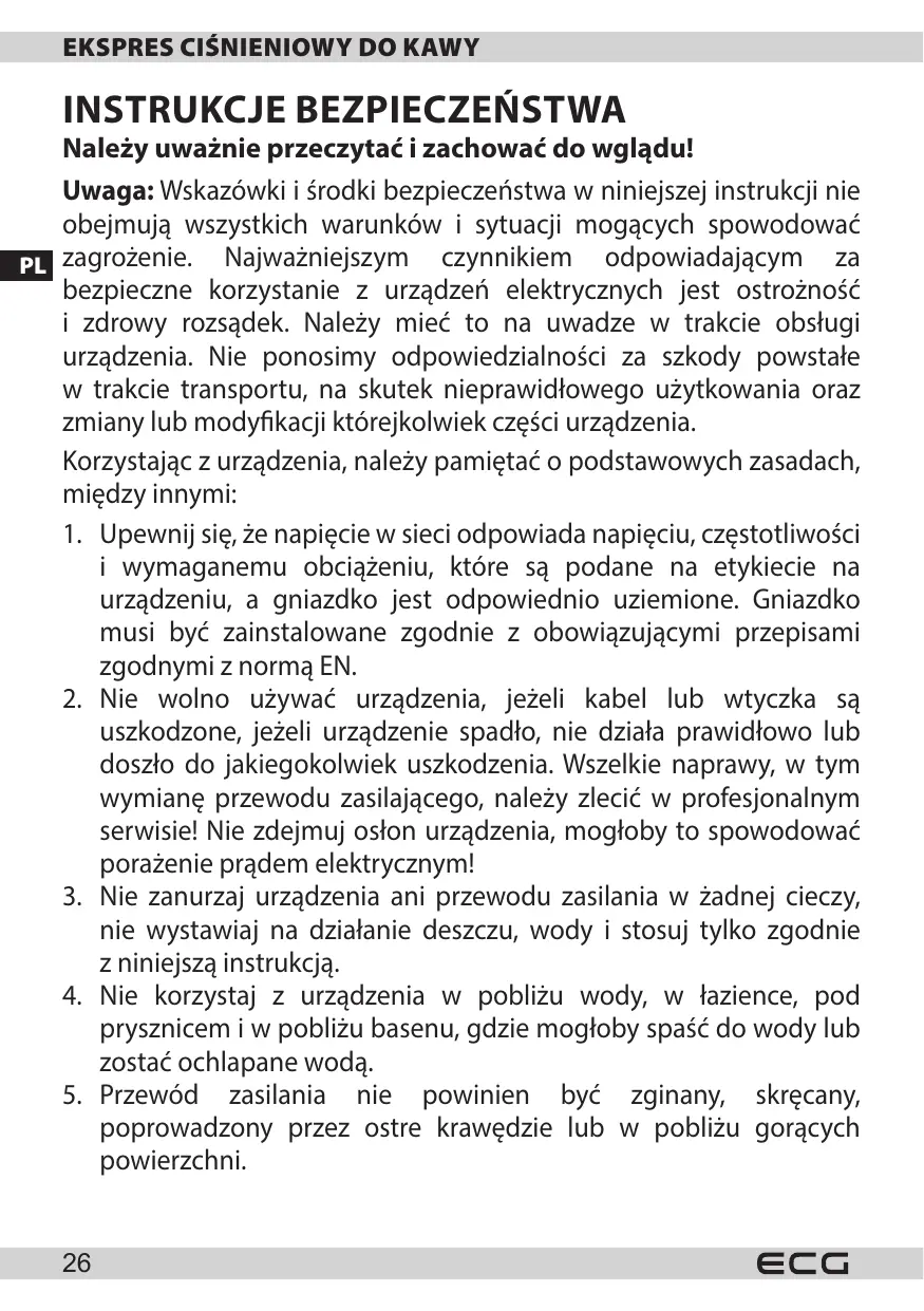 - ECG nie ponosi odpowiedzialnosci za szkody lub obrażenia spowodowane przy bez nieprawidłowe lub niedbały uzytkowanie. Przed uzyciem przyczytaj uwȩznie wszychstkie instrukcje i informacja. Powierzchnia zewétrzna urzadzenia rożgrzewa są i我会 spowodowej oparzenia. Nie pozostawiaz urzadzenia bez nadzoru w obecnosci daneci.