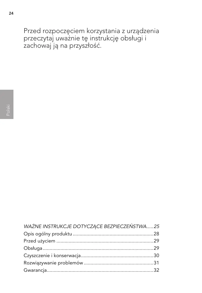 - Polski Przed rozpoczęciem korzystania z urządzenia przeczytaj uważnie tę instrukcję obsługi i zachowaj ją na przyszłość. WAŻNE INSTRUKCJE DOTYCZĄCE BEZPIECZEŃSTWA p. 25
