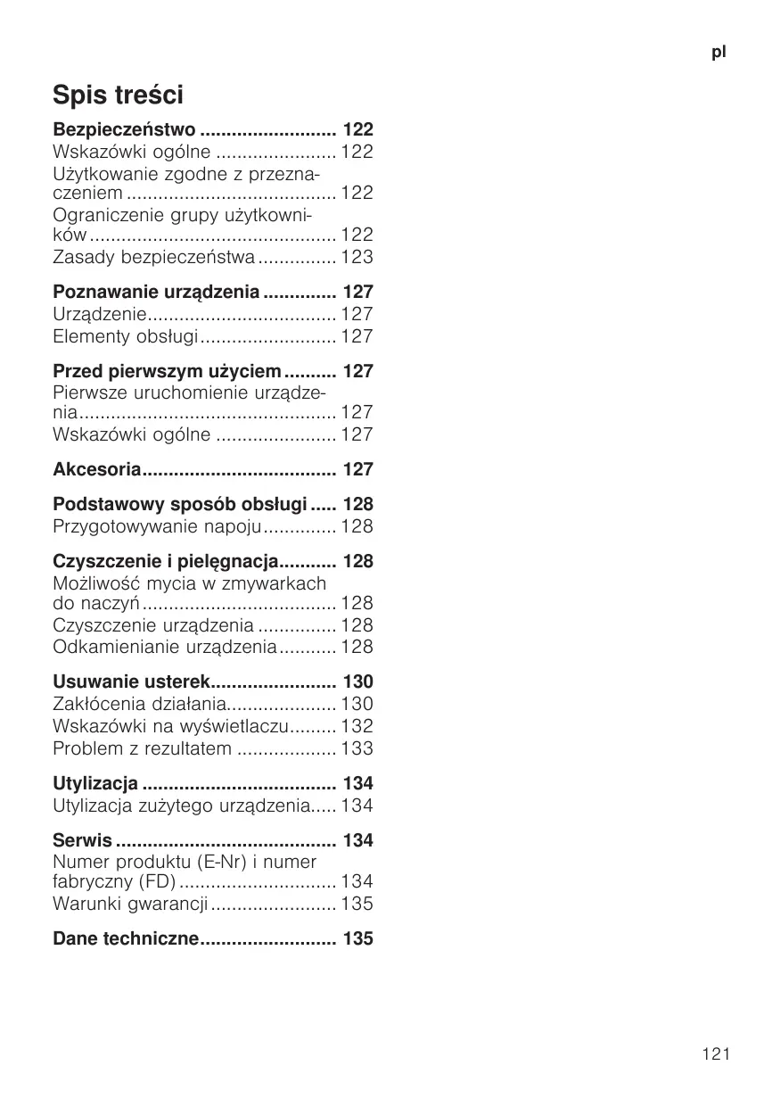 Spis treści Bezpieczeństwo 122 Wskazówki ogólne 122 Użytkowanie zgodne z przeznaczeniem 122 Ograniczenie grupy użytkowników 122 Zasady bezpieczeństwa 123 Poznawanie urządzenia 127 Urządzenie 127 Elementy obsługi 127 Przed pierwszym użyciem 127 Pierwsze uruchomienie urządzenia 127 Wskazówki ogólne 127 Akcesoria 127 Podstawowy sposób obsługi 128 Przygotowywanie napoju 128 Czyszczenie i pielęgnacja 128 Możliwość mycia w zmywarkach do naczyń 128 Czyszczenie urządzenia 128 Odkamienianie urządzenia 128 Usuwanie usterek 130 Zakłócenia działania 130 Wskazówki na wyświetlaczu 132 Problem z rezultatem 133 Utylizacja 134 Utylizacja zużytego urządzenia 134 Serwis 134 Numer produktu (E-Nr) i numer fabryczny (FD) 134 Warunki gwarancji 135 Dane techniczne 135