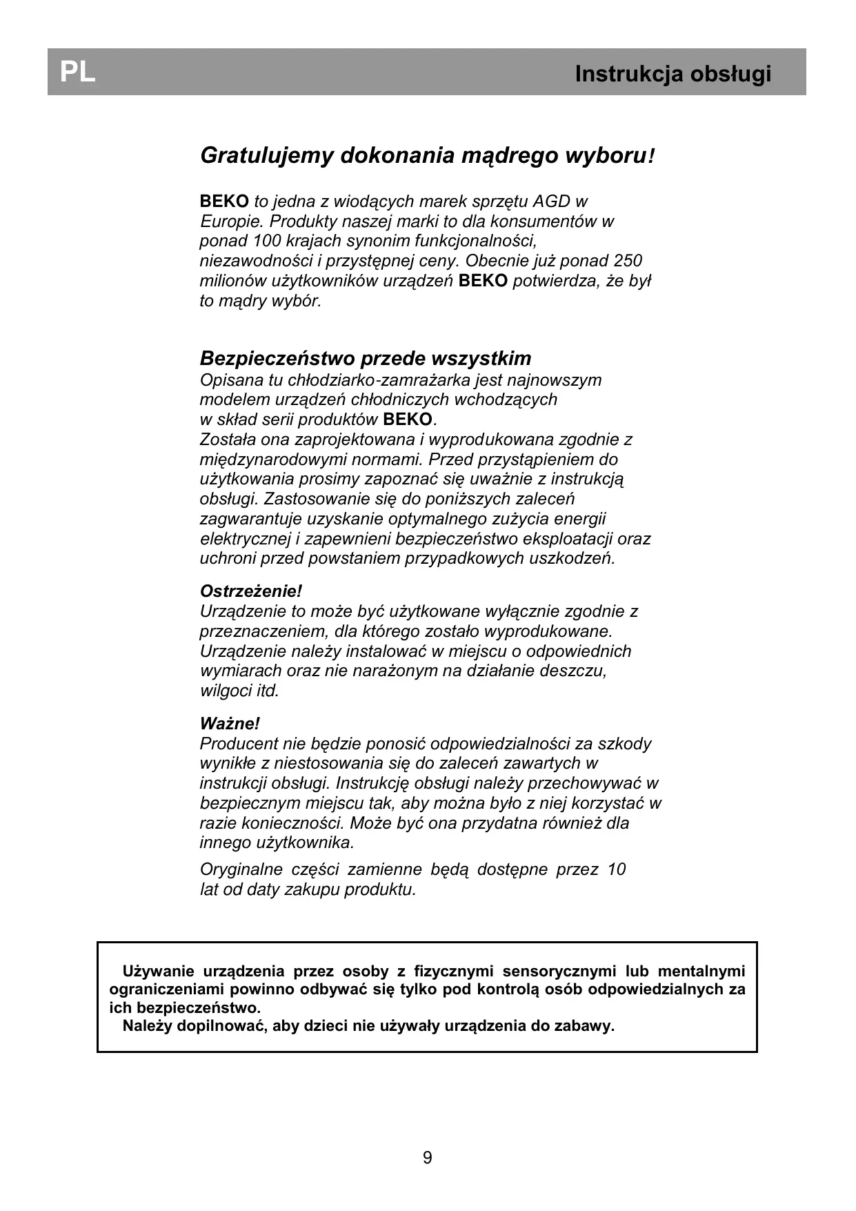 Uzywanie urzadzenia przyez osoby z fizycznych sensorycznych lub mentalnyi ograniczeniami powinno odbywać są tylko pod kontrolaość odśob odpowiedzialnych za ich bezpieczność.