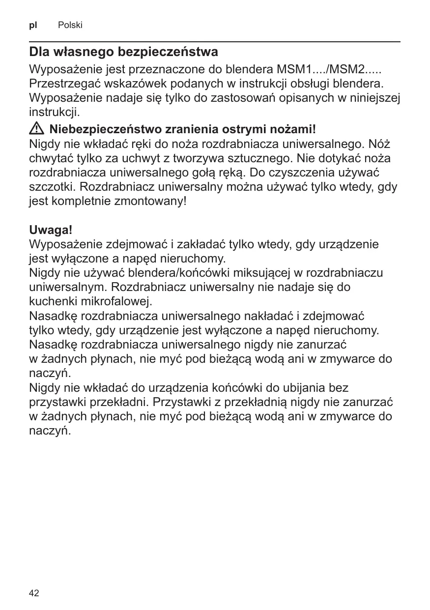 Polski Dla własnego bezpieczeństwa Wyposażenie jest przeznaczone do blendera MSM1..../MSM2..... Przestrzegać wskazówek podanych w instrukcji obsługi blendera. Wyposażenie nadaje się tylko do zastosowań opisanych w niniejszej instrukcji. WW Niebezpieczeństwo zranienia ostrymi nożami! Nigdy nie wkładać ręki do noża rozdrabniacza uniwersalnego. Nóż chwytać tylko za uchwyt z tworzywa sztucznego. Nie dotykać noża rozdrabniacza uniwersalnego gołą ręką. Do czyszczenia używać szczotki. Rozdrabniacz uniwersalny można używać tylko wtedy, gdy jest kompletnie zmontowany! Uwaga! Wyposażenie zdejmować i zakładać tylko wtedy, gdy urządzenie jest wyłączone a napęd nieruchomy. Nigdy nie używać blendera/końcówki miksującej w rozdrabniaczu uniwersalnym. Rozdrabniacz uniwersalny nie nadaje się do kuchenki mikrofalowej. Nasadkę rozdrabniacza uniwersalnego nakładać i zdejmować tylko wtedy, gdy urządzenie jest wyłączone a napęd nieruchomy. Nasadkę rozdrabniacza uniwersalnego nigdy nie zanurzać w żadnych płynach, nie myć pod bieżącą wodą ani w zmywarce do naczyń. Nigdy nie wkładać do urządzenia końcówki do ubijania bez przystawki przekładni. Przystawki z przekładnią nigdy nie zanurzać w żadnych płynach, nie myć pod bieżącą wodą ani w zmywarce do naczyń.
