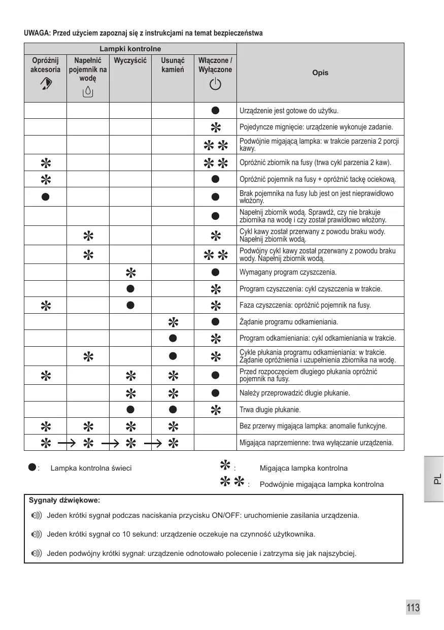 Vider le collecteur de marc (un cycle de 2 cafés est en cours). Vider le collecteur de marc + vider le bac récoltegouttes. Le collecteur de marc est absent ou mal positionné. Remplir le réservoir d'eau. Le réservoir d'eau est absent ou mal positionné. Le cycle café a été interrompu par manque d'eau. Remplir le réservoir d'eau. Le cycle double café a été interrompu par manque d'eau. Remplir le réservoir. Programme de nettoyage demandé. Programme de nettoyage : cycle de nettoyage en cours. Phase de nettoyage : vider le bac à marc. Programme de détartrage demandé. Programme de détartrage : cycle de détartrage en cours. Cycles de rinçage du programme de détartrage : en cours. Demande de vider et de remplir le réservoir d'eau. Vider le bac à cake avant le lancement d'un rinçage long. Demande rinçage long. Rinçage long en cours. Clignotement Simultané : anomalie de fonctionnement. Clignotement voyant après voyant : mise en hors tension de l'appareil en cours. :