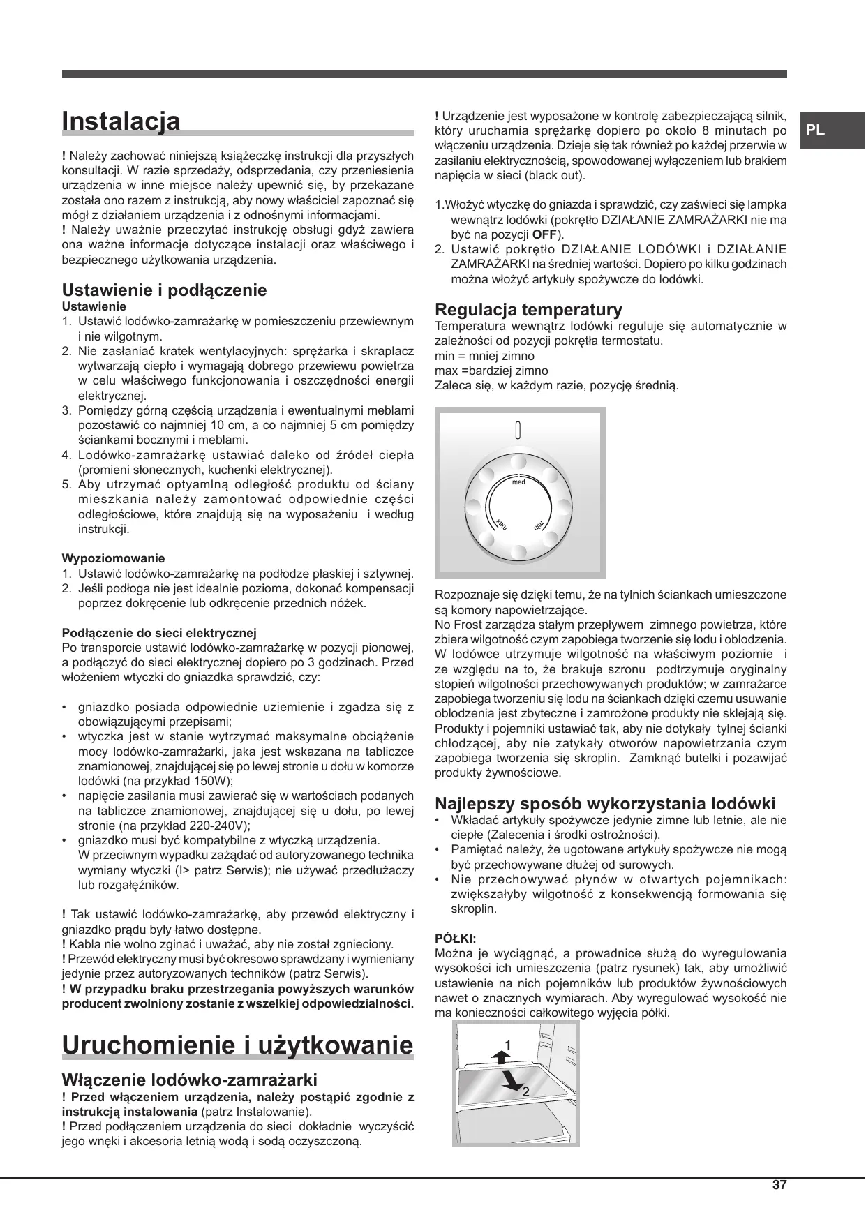 2. Amenez le bouton FONCTIONNEMENT CONGELATEUR et louton FONCTIONNEMENT REFRIGERATEUR sur une valeur intermédiaire. Au bout de quelques heures, vous pourrez commencer à stocker des aliments dans le réfrigérateur.