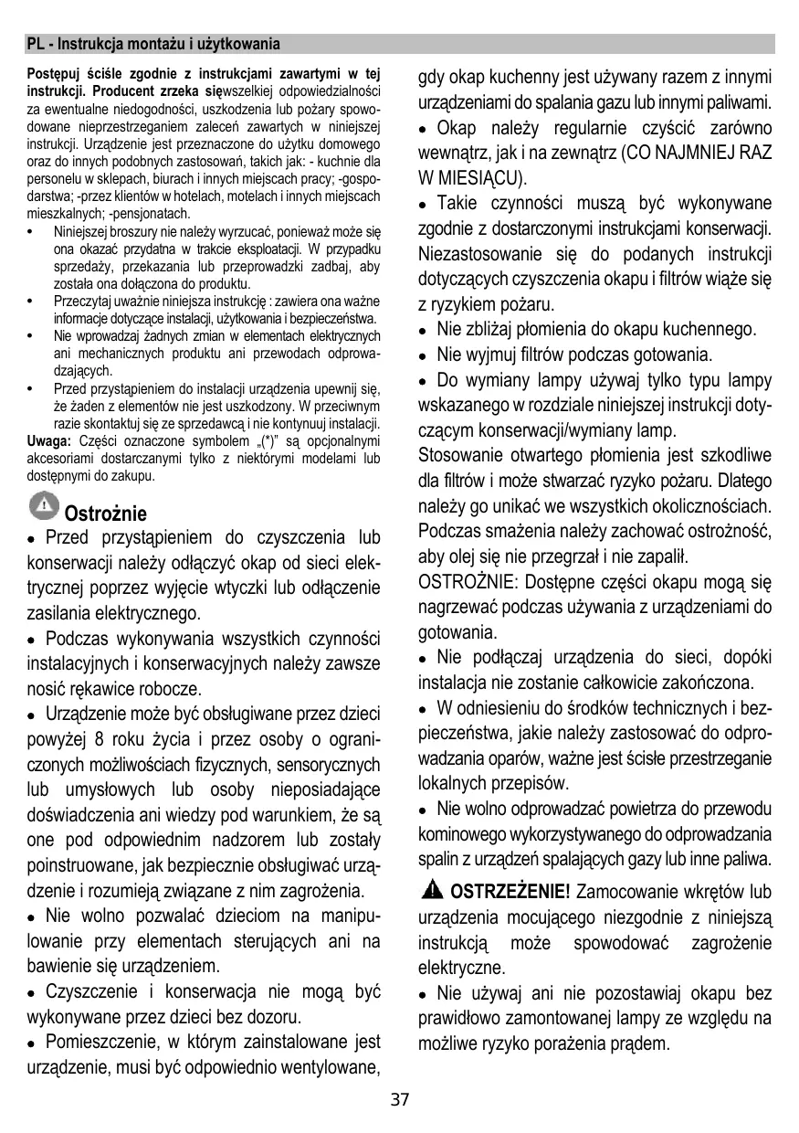 • Cet appareil peut être utilisé par les enfants de plus de 8 ans et les personnes ayant des capacités physiques, sensorielles ou mentales réduites ou un manque d’expérience et de connaissances, s’ils ont été supervisés ou si on leur a appris à utiliser l’appareil en toute sécurité et qu’ils comprennent les risques courus. • Les enfants ne doivent pas toucher aux commandes ni jouer avec l'appareil. • Le nettoyage et l’entretien ne doivent pas être effectués par des enfants sans surveillance. • Les locaux où l'appareil est installé doivent être suffisamment ventilés lorsque la hotte de cuisine est utilisée avec d'autres dispositifs à combustion de gaz ou autres combustibles. •