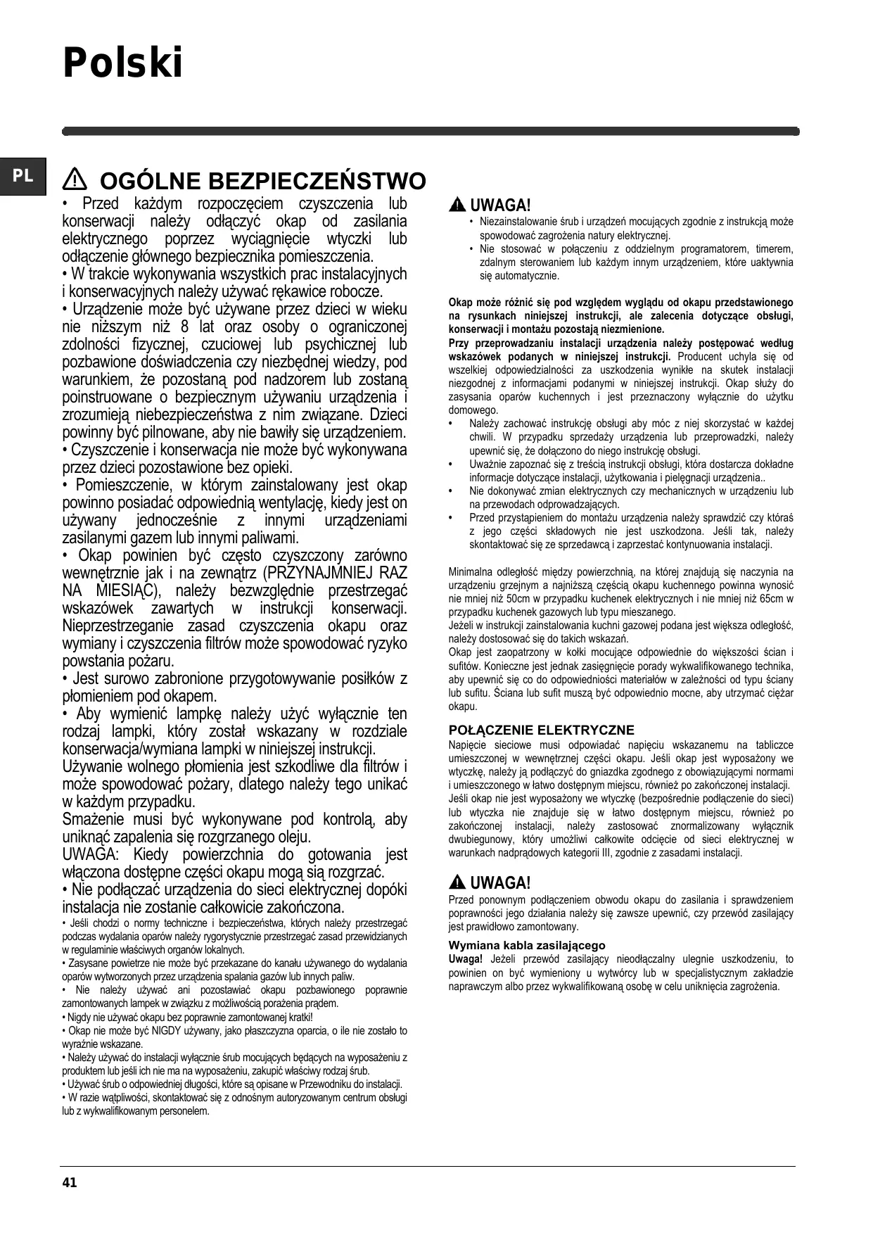 • Les enfants ne doivent pas jouer avec l’appareil. • Le nettoyage et l’entretien par l’usager ne doivent pas être effectués par des enfants sans surveillance. • La pièce doit avoir une aération suffisante lorsque la hotte est utilisée conjointement avec d'autres appareils fonctionnant au gaz ou autres combustibles. • La hotte doit être régulièrement nettoyée à la fois à l'intérieur et à l'extérieur (AU MOINS UNE FOIS PAR MOIS); cela devrait se faire en conformité avec les instructions d'entretien. Le non respect des instructions expressément fournies concernant le nettoyage de la hotte et des filtres peut provoquer des risques d'incendie. • Ne pas flamber d’aliments sous la hotte. • Pour le remplacement de la lampe, utilisez uniquement le type de lampe spécifié dans la section remplacement/maintenance lampe dans ce manuel. L'utilisation d'une flamme nue est dommageable pour les filtres et peut causer un incendie, par conséquent, il est déconseillé de l'utiliser. La friture doit être faite avec soin afin de s’assurer que l’huile surchauffée ne prenne pas feu. AVERTISSEMENT: Lorsque la table de cuisson est en fonctionnement, les parties accessibles de la hotte peuvent devenir très chaudes. • Ne pas brancher l'appareil au réseau électrique avant que l'installation est complètement terminée.