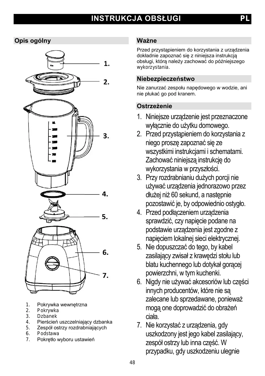 1. Niniejsze urządzenie jest przeznaczone wyłącznie do użytku domowego. 2. Przed przystąpieniem do korzystania z niego proszę zapoznać się ze wszystkimi instrukcjami i schematami. Zachować niniejszą instrukcję do wykorzystania w przyszłości. 3. Przy rozdrabnianiu dużych porcji nie używać urządzenia jednorazowo przez dłużej niż 60 sekund, a następnie pozostawić je, by odpowiednio ostygło. 4. Przed podłączeniem urządzenia sprawdzić, czy napięcie podane na podstawie urządzenia jest zgodne z napięciem lokalnej sieci elektrycznej. 5. Nie dopuszczać do tego, by kabel zasilający zwisał z krawędzi stołu lub blatu kuchennego lub dotykał gorącej powierzchni, w tym kuchenki. 6. Nigdy nie używać akcesoriów lub części innych producentów, które nie są zalecane lub sprzedawane, ponieważ mogą one doprowadzić do obrażeń ciała. 7. Nie korzystać z urządzenia, gdy uszkodzony jest jego kabel zasilający, zespół ostrzy lub inna część. W przypadku, gdy uszkodzeniu ulegnie