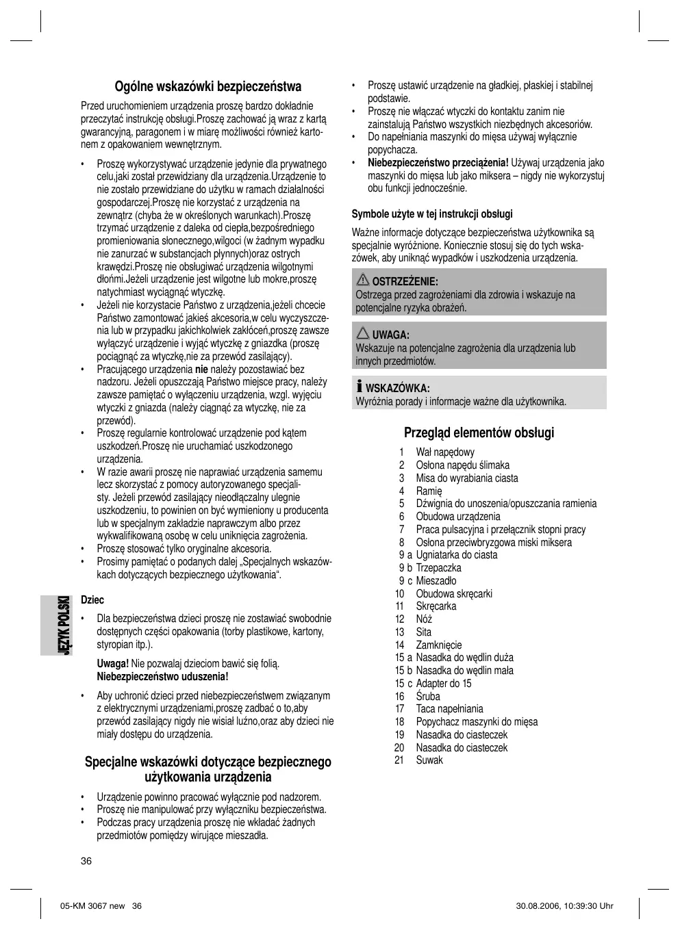 Przegląd elementów obłsugiStrona 3 Instrukcja obsługi Strona 36 Dane techniczne Strona 39 Gwarancja Strona 39