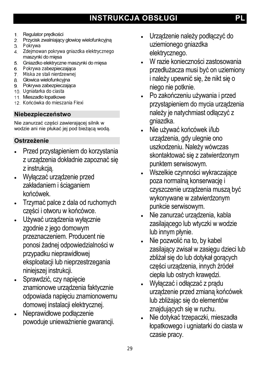 Obturateur amovible pour la prise de courant du hachoir Bouton de déverrouillage du couteau Prise de courant pour le hachoir Couvercle du bol Bol en acier inoxydable Tête multifonction Fouet Crochet pétrisseur éléments mobiles et des orifices destinés à l'insertion des accessoires. Utilisez l'appareil uniquement pour l'usage ménager auquel il est destiné. Le fabricant déclinera toute responsabilité si l'appareil fait l'objet d'une utilisation inappropriée ou si les présentes instructions ne sont pas respectées. Vérifiez que la tension nominale de votre appareil correspond bien à celle de votre réseau électrique. Toute erreur de raccordement annulera la garantie. L'appareil doit être branché à une prise raccordée à la terre.