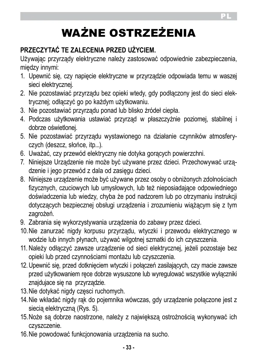 2. Ne laissez jamais l’appareil sans surveillance lorsqu’il est branché au réseau électrique; débranchez-le après chaque utilisation. 3. Ne placez pas l’appareil au dessus ou près de sources de chaleur. 4. Lors de son utilisation, placez l’appareil sur une surface horizontale et stable. 5. N’exposez jamais l’appareil aux agents atmosphériques externes (pluie, soleil, etc.). 6. Veillez à ce que le câble électrique n’entre jamais en contact avec des surfaces chaudes. 7. Cet appareil ne doit pas être utilisé par les enfants. Garder l’appareil et son cordon électrique hors de la portée des enfants. 8. Cet appareil peut être utilisé par des personnes aux capacités physiques, sensorielles ou mentales réduites ou sans expérience ni connaissance si elles sont surveillées ou si elles ont reçu des instructions concernant l’emploi en toute sécurité de l’appareil et si elles ont compris les dangers qui y sont liés. 9. Les enfants ne doivent pas jouer avec l’appareil. 10. Ne pas plonger le corps du produit, la fiche ni le cable electrique dans l’eau ou autres liquides, et utiliser toujours un chiffon humide pour les nettoyer. 11. Débrancher toujours l’appareil du courant électrique quand il n’est pas utilisé et avant de l’assembler, de le démonter ou de le nettoyer. 12. Vérifier d’avoir toujours les mains sèches avant d’utiliser ou de régler les interrupteurs placés sur l’appareil ou avant de manipuler la fiche et les connexions électriques. 13. Ne touchez jamais les parties en mouvement. 14. N’introduisez jamais vos mains dans la tasse quand l’appareil est branché au réseau électrique (Fig. 5). 15. Prêtez la plus grande attention lors du nettoyage des lames car elles sont extrêmement affûtées. 16. Ne faites pas fonctionner l’appareil à vide. 17. N’utilisez pas l’appareil si la lame est endommagée. -9-