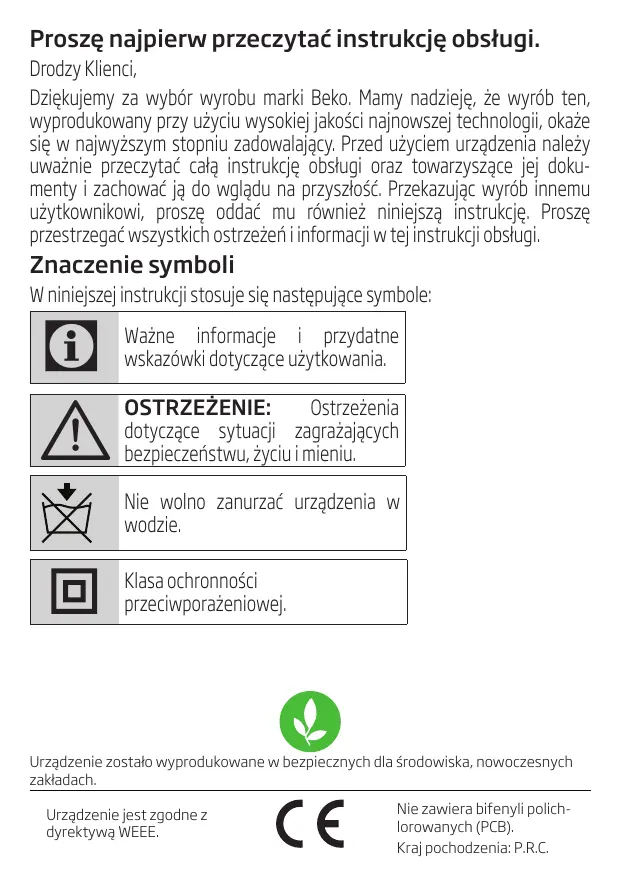 Drodzy Klienci, Dziękujemy za wybór wyrobu marki Beko. Mamy nadzieję, że wyrób ten, wyprodukowany przy użyciu wysokiej jakości najnowszej technologii, okaże się w najwyższym stopniu zadowalający. Przed użyciem urządzenia należy uważnie przeczytać całą instrukcję obsługi oraz towarzyszące jej dokumenty i zachować ją do wglądu na przyszłość. Przekazując wyrób innemu użytkownikowi, proszę oddać mu również niniejszą instrukcję. Proszę przestrzegać wszystkich ostrzeżeń i informacji w tej instrukcji obsługi.