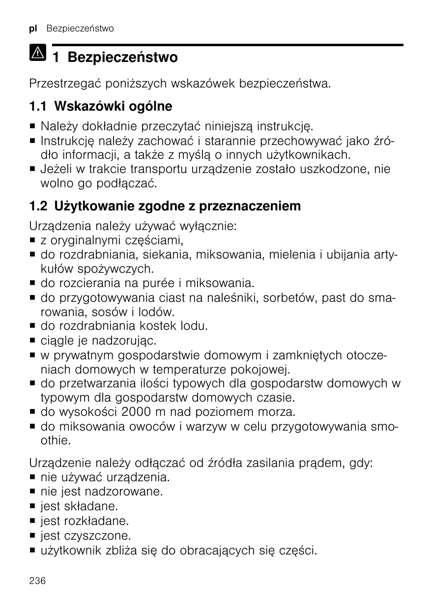 7.7 Vider le bol blender 54 7.8 Transformer les aliments avec la gourde 54 7.9 Fermer la gourde 54 7.10 Transformer les aliments avec l'accessoire hachoir/ broyeur 55 7.11 Vider l'accessoire hachoir/ broyeur 55 8 Nettoyage et entretien 55 8.1 Nettoyage au lave-vaisselle 55 8.2 Produits de nettoyage 56 8.3 Nettoyer l'appareil de base 56 8.4 Nettoyer le bol blender 56 8.5 Nettoyer la gourde et son support de lames 57 8.6 Nettoyer l'accessoire hachoir/broyeur 57 9 Recettes 57 9.1 Liste des recettes 57 10 Dépannage 59 ¡ pour mixer et réduire en purée. ¡ pour préparer de la pâte à crêpes, des sorbets, des pâtes à tartiner, des sauces et de la crème glacée. ¡ pour broyer des glaçons. ¡ sous surveillance. ¡ pour un usage domestique privé et dans les pièces fermées d’un domicile, à la température ambiante. ¡ pour les quantités de préparation et durées de traitement habituelles pour un ménage. ¡ jusqu'à une altitude maximale de 2000 m au-dessus du niveau de la mer. ¡ pour mixer les fruits et légumes et préparer des smoothies. Débranchez l’appareil du secteur lorsque : ¡ vous n'utilisez pas l'appareil. ¡ vous ne surveillez pas l’appareil. ¡ vous assemblez l’appareil. ¡ vous démontez l’appareil. ¡ vous nettoyez l’appareil. 45