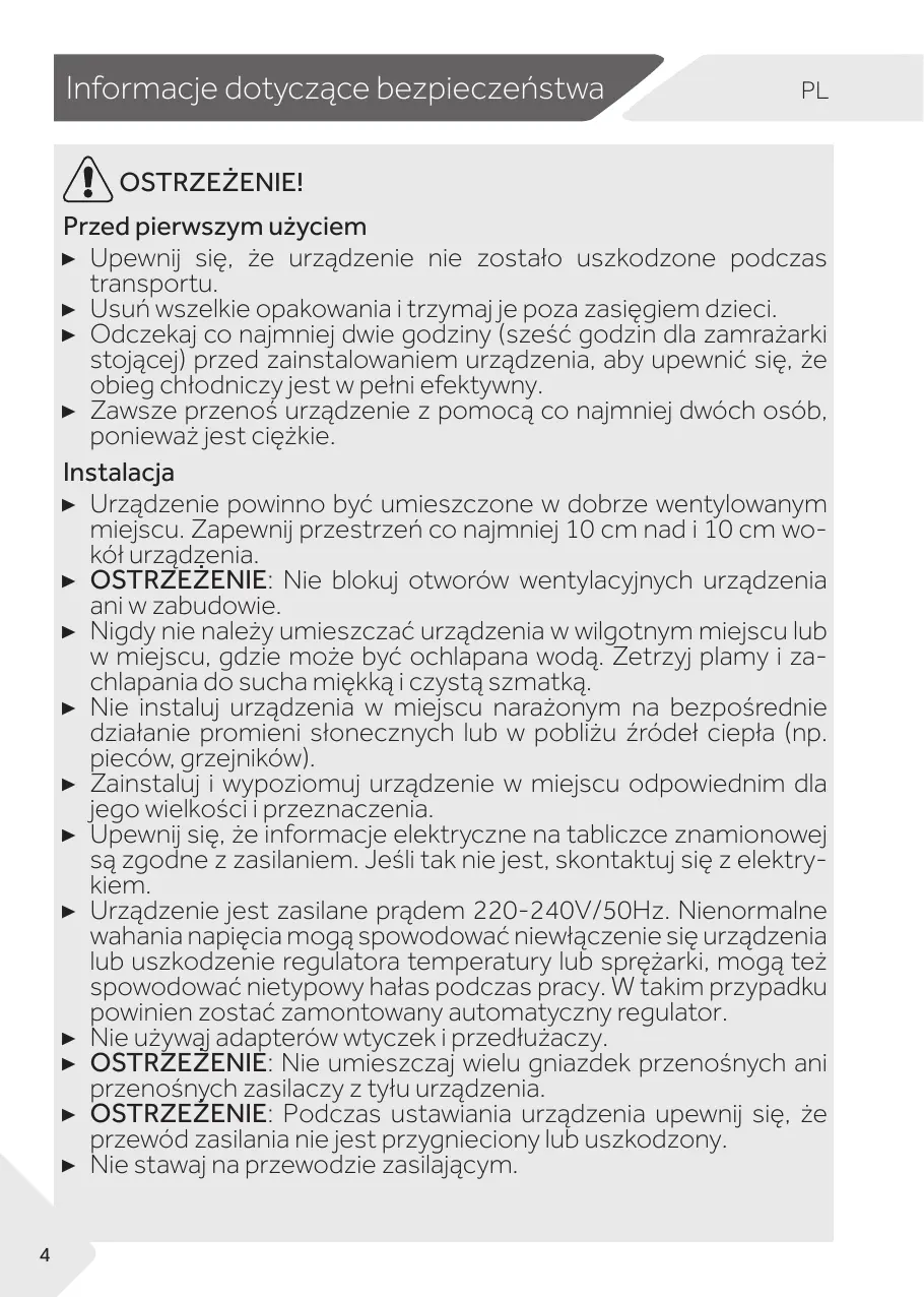 PL OSTRZEŻENIE! Przed pierwszym użyciem ▶ Upewnij się, że urządzenie nie zostało uszkodzone podczas transportu. ▶ Usuń wszelkie opakowania i trzymaj je poza zasięgiem dzieci. ▶ Odczekaj co najmniej dwie godziny (sześć godzin dla zamrażarki stojącej) przed zainstalowaniem urządzenia, aby upewnić się, że obieg chłodniczy jest w pełni efektywny. ▶ Zawsze przenoś urządzenie z pomocą co najmniej dwóch osób, ponieważ jest ciężkie. Instalacja ▶ Urządzenie powinno być umieszczone w dobrze wentylowanym miejscu. Zapewnij przestrzeń co najmniej 10 cm nad i 10 cm wokół urządzenia. ▶ OSTRZEŻENIE: Nie blokuj otworów wentylacyjnych urządzenia ani w zabudowie. ▶ Nigdy nie należy umieszczać urządzenia w wilgotnym miejscu lub w miejscu, gdzie może być ochlapana wodą. Zetrzyj plamy i zachlapania do sucha miękką i czystą szmatką. ▶ Nie instaluj urządzenia w miejscu narażonym na bezpośrednie działanie promieni słonecznych lub w pobliżu źródeł ciepła (np. pieców, grzejników). ▶ Zainstaluj i wypoziomuj urządzenie w miejscu odpowiednim dla jego wielkości i przeznaczenia. ▶ Upewnij się, że informacje elektryczne na tabliczce znamionowej są zgodne z zasilaniem. Jeśli tak nie jest, skontaktuj się z elektrykiem. ▶ Urządzenie jest zasilane prądem 220-240V/50Hz. Nienormalne wahania napięcia mogą spowodować niewłączenie się urządzenia lub uszkodzenie regulatora temperatury lub sprężarki, mogą też spowodować nietypowy hałas podczas pracy. W takim przypadku powinien zostać zamontowany automatyczny regulator. ▶ Nie używaj adapterów wtyczek i przedłużaczy. ▶ OSTRZEŻENIE: Nie umieszczaj wielu gniazdek przenośnych ani przenośnych zasilaczy z tyłu urządzenia. ▶ OSTRZEŻENIE: Podczas ustawiania urządzenia upewnij się, że przewód zasilania nie jest przygnieciony lub uszkodzony. ▶ Nie stawaj na przewodzie zasilającym. 4