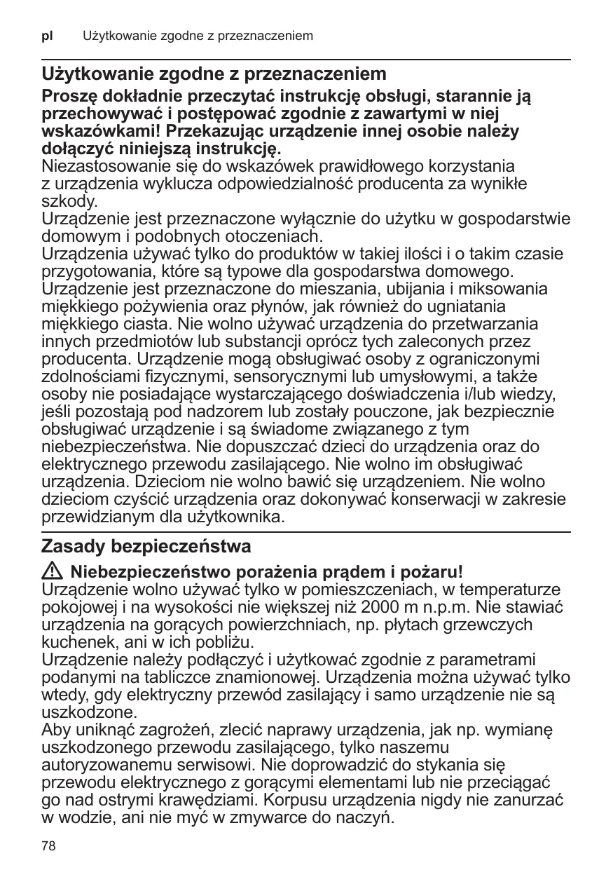 Gerät niemals an Zeitschaltuhren oder fernbedienbaren Steckdosen anschließen. Bei Stromunterbrechung bleibt das Gerät eingeschaltet und läuft nach der Unterbrechung wieder an. Gerät sofort ausschalten. Das Gerät während des Betriebs stets beaufsichtigen! Das Gerät niemals länger eingeschaltet lassen, wie für die Cet appareil est destiné exclusivement à une utilisation domestique et non professionnelle. Utiliser cet appareil uniquement pour des quantités de préparations culinaires courantes et pour des durées de service normales. L’appareil est conçu pour mélanger, battre et mixer des aliments tendres et des liquides ainsi que pour pétrir des pâtes molles. L’appareil ne doit pas servir à transformer d’autres substances ou objets. Cet appareil peut être utilisé par des personnes aux capacités physiques, sensorielles ou mentales réduites ou des personnes inexpérimentées, à condition qu’elles soient surveillées ou qu’elles aient été informées de l’utilisation sûre de l’appareil et qu’elles comprennent les risques inhérents à son usage. Il faut tenir les enfants à l’écart de l’appareil et du cordon de branchement et ne pas leur permettre d’utiliser l’appareil. Ne pas laisser les enfants jouer avec l’appareil. Le nettoyage et l’entretien incombant à l’utilisateur ne doivent pas être effectués par des enfants.