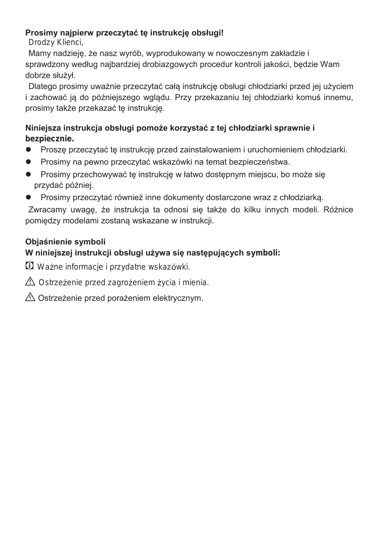 20 EN Prosimy najpierw przeczytać tę instrukcję obsługi! Drodzy Klienci, Mamy nadzieję, że nasz wyrób, wyprodukowany w nowoczesnym zakładzie i sprawdzony według najbardziej drobiazgowych procedur kontroli jakości, będzie Wam dobrze służył. Dlatego prosimy uważnie przeczytać całą instrukcję obsługi chłodziarki przed jej użyciem i zachować ją do późniejszego wglądu. Przy przekazaniu tej chłodziarki komuś innemu, prosimy także przekazać tę instrukcję. Niniejsza instrukcja obsługi pomoże korzystać z tej chłodziarki sprawnie i bezpiecznie. Proszę przeczytać tę instrukcję przed zainstalowaniem i uruchomieniem chłodziarki. Prosimy na pewno przeczytać wskazówki na temat bezpieczeństwa. Prosimy przechowywać tę instrukcję w łatwo dostępnym miejscu, bo może się przydać później. Prosimy przeczytać również inne dokumenty dostarczone wraz z chłodziarką. Zwracamy uwagę, że instrukcja ta odnosi się także do kilku innych modeli. Różnice pomiędzy modelami zostaną wskazane w instrukcji. Objaśnienie symboli W niniejszej instrukcji obsługi używa się następujących symboli: Wa ne informacje i przydatne wskaz wki. Ostrze enie przed zagro eniem ycia i mienia. Ostrzeżenie przed porażeniem elektrycznym.