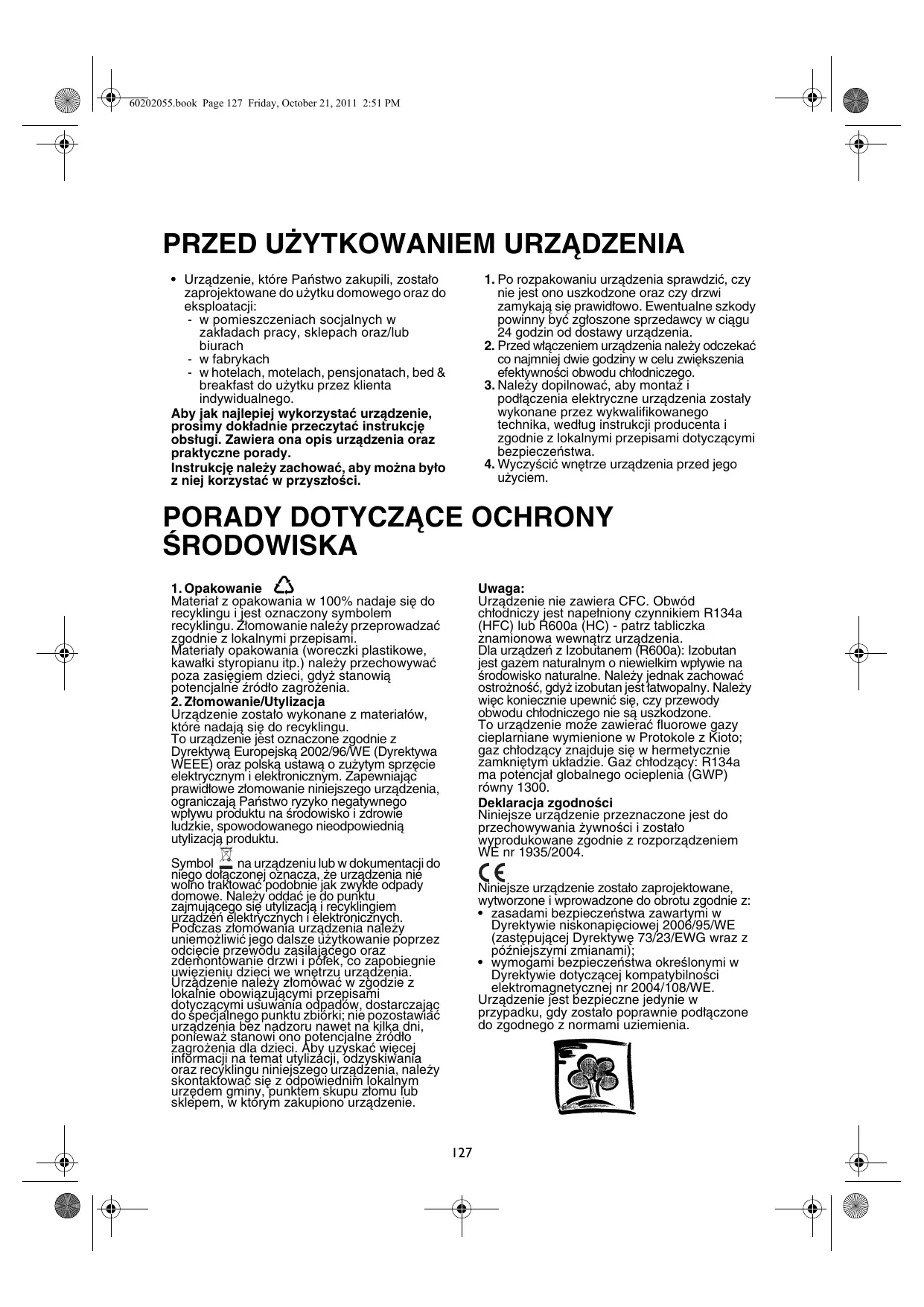 Urządzenie zostało wykonane z materiałów, które nadają się do recyklingu. To urządzenie jest oznaczone zgodnie z Dyrektywą Europejską 2002/96/WE (Dyrektywa WEEE) oraz polską ustawą o zużytym sprzęcie elektrycznym i elektronicznym. Zapewniając prawidłowe złomowanie niniejszego urządzenia, ograniczają Państwo ryzyko negatywnego wpływu produktu na środowisko i zdrowie ludzkie, spowodowanego nieodpowiednią utylizacją produktu. Uwaga: Urządzenie nie zawiera CFC. Obwód chłodniczy jest napełniony czynnikiem R134a (HFC) lub R600a (HC) - patrz tabliczka znamionowa wewnątrz urządzenia. Dla urządzeń z Izobutanem (R600a): Izobutan jest gazem naturalnym o niewielkim wpływie na środowisko naturalne. Należy jednak zachować ostrożność, gdyż izobutan jest łatwopalny. Należy więc koniecznie upewnić się, czy przewody obwodu chłodniczego nie są uszkodzone. To urządzenie może zawierać fluorowe gazy cieplarniane wymienione w Protokole z Kioto; gaz chłodzący znajduje się w hermetycznie zamkniętym układzie. Gaz chłodzący: R134a ma potencjał globalnego ocieplenia (GWP) równy 1300. Deklaracja zgodności Niniejsze urządzenie przeznaczone jest do przechowywania żywności i zostało wyprodukowane zgodnie z rozporządzeniem WE nr 1935/2004. Symbol na urządzeniu lub w dokumentacji do niego dołączonej oznacza, że urządzenia nie wolno traktować podobnie jak zwykłe odpady domowe. Należy oddać je do punktu zajmującego się utylizacją i recyklingiem urządzeń elektrycznych i elektronicznych. Podczas złomowania urządzenia należy uniemożliwić jego dalsze użytkowanie poprzez odcięcie przewodu zasilającego oraz zdemontowanie drzwi i półek, co zapobiegnie uwięzieniu dzieci we wnętrzu urządzenia. Urządzenie należy złomować w zgodzie z lokalnie obowiązującymi przepisami dotyczącymi usuwania odpadów, dostarczając do specjalnego punktu zbiórki; nie pozostawiać urządzenia bez nadzoru nawet na kilka dni, ponieważ stanowi ono potencjalne źródło zagrożenia dla dzieci. Aby uzyskać więcej informacji na temat utylizacji, odzyskiwania oraz recyklingu niniejszego urządzenia, należy skontaktować się z odpowiednim lokalnym urzędem gminy, punktem skupu złomu lub sklepem, w którym zakupiono urządzenie. Niniejsze urządzenie zostało zaprojektowane, wytworzone i wprowadzone do obrotu zgodnie z: