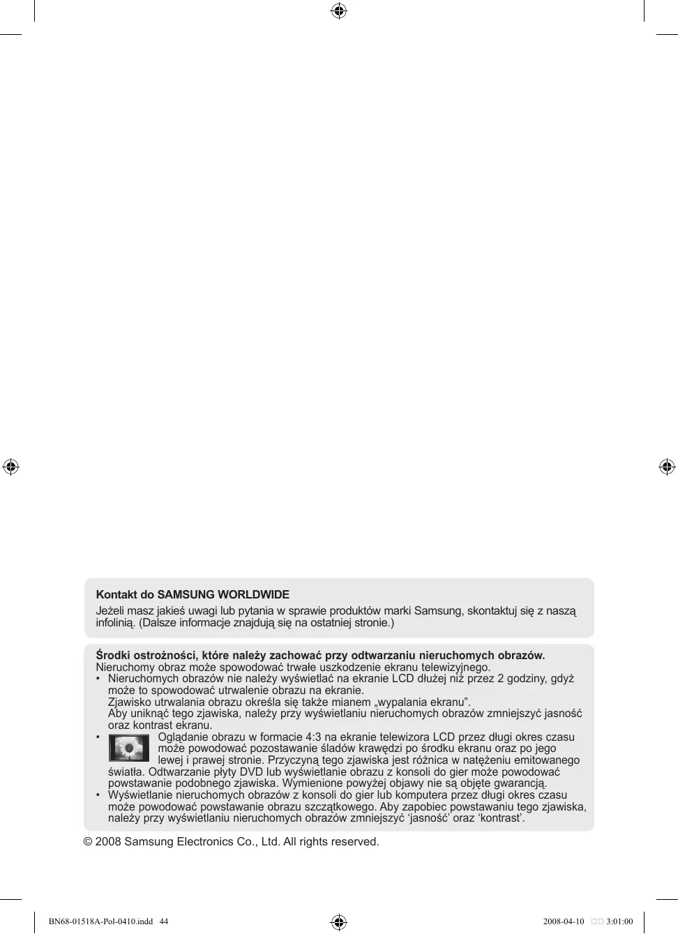 - Nieruchomych obrazów nie należy wyświetlać na ekranie LCD dłużej niż przez 2 godziny, gdyż może to spowodować utrwalenie obrazu na ekranie. Zjawisko utrwalania obrazu określa się także mianem „wypalania ekranu”. Aby uniknąć tego zjawiska, należy przy wyświetlaniu nieruchomych obrazów zmniejszyć jasność oraz kontrast ekranu. Oglądanie obrazu w formacie 4:3 na ekranie telewizora LCD przez długi okres czasu może powodować pozostawanie śladów krawędzi po środku ekranu oraz po jego lewej i prawej stronie. Przyczyną tego zjawiska jest różnica w natężeniu emitowanego światła. Odtwarzanie płyty DVD lub wyświetlanie obrazu z konsoli do gier może powodować powstawanie podobnego zjawiska. Wymienione powyżej objawy nie są objęte gwarancją.