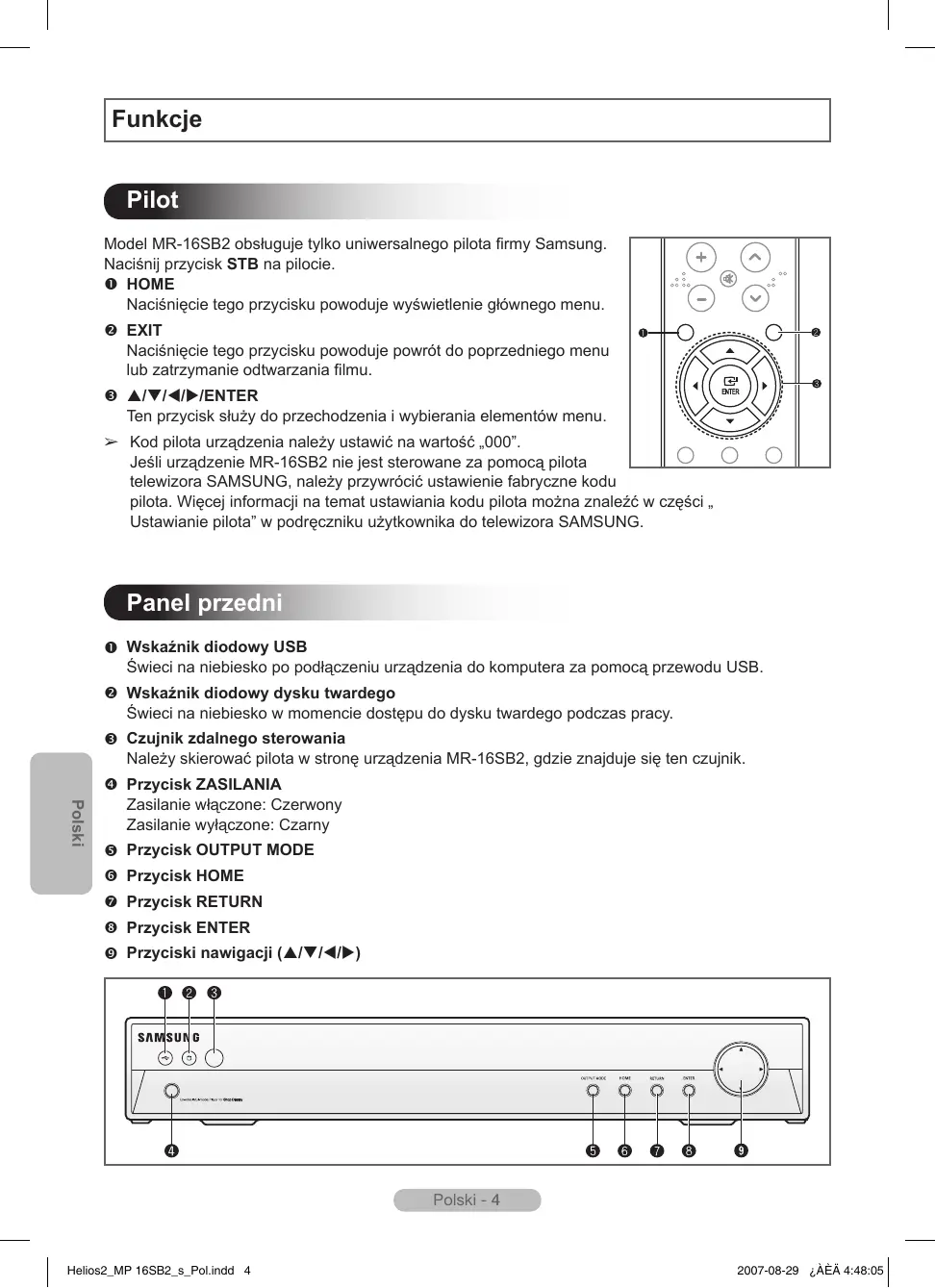 Funkcje Pilot Model MR-16SB2 obsługuje tylko uniwersalnego pilota firmy Samsung. Naciśnij przycisk STB na pilocie. HOME Naciśnięcie tego przycisku powoduje wyświetlenie głównego menu. EXIT Naciśnięcie tego przycisku powoduje powrót do poprzedniego menu lub zatrzymanie odtwarzania filmu. ////ENTER Ten przycisk służy do przechodzenia i wybierania elementów menu. ➢ Kod pilota urządzenia należy ustawić na wartość „000”. Jeśli urządzenie MR-16SB2 nie jest sterowane za pomocą pilota telewizora SAMSUNG, należy przywrócić ustawienie fabryczne kodu pilota. Więcej informacji na temat ustawiania kodu pilota można znaleźć w części „ Ustawianie pilota” w podręczniku użytkownika do telewizora SAMSUNG.