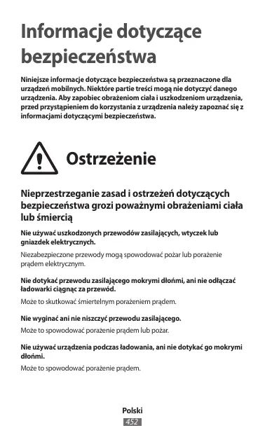 Informacje dotyczące bezpieczeństwa Niniejsze informacje dotyczące bezpieczeństwa są przeznaczone dla urządzeń mobilnych. Niektóre partie treści mogą nie dotyczyć danego urządzenia. Aby zapobiec obrażeniom ciała i uszkodzeniom urządzenia, przed przystąpieniem do korzystania z urządzenia należy zapoznać się z informacjami dotyczącymi bezpieczeństwa. Ostrzeżenie Nieprzestrzeganie zasad i ostrzeżeń dotyczących bezpieczeństwa grozi poważnymi obrażeniami ciała lub śmiercią Nie używać uszkodzonych przewodów zasilających, wtyczek lub gniazdek elektrycznych. Niezabezpieczone przewody mogą spowodować pożar lub porażenie prądem elektrycznym. Nie dotykać przewodu zasilającego mokrymi dłońmi, ani nie odłączać ładowarki ciągnąc za przewód. Może to skutkować śmiertelnym porażeniem prądem. Nie wyginać ani nie niszczyć przewodu zasilającego. Może to spowodować porażenie prądem lub pożar. Nie używać urządzenia podczas ładowania, ani nie dotykać go mokrymi dłońmi. Może to spowodować porażenie prądem. Polski