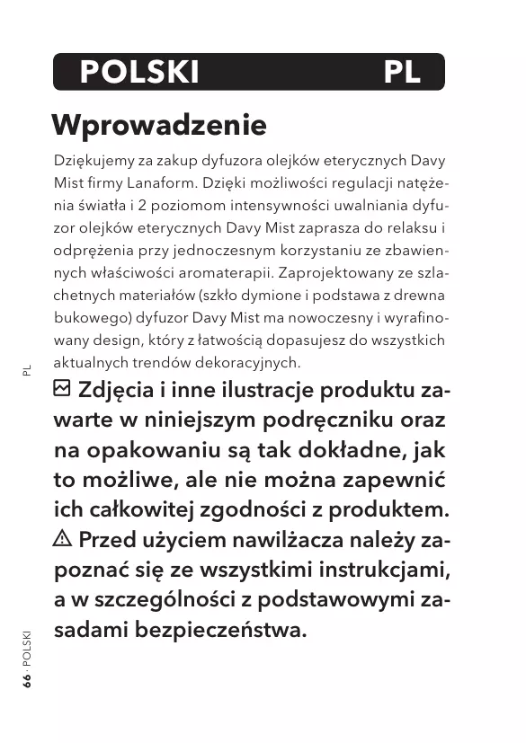 PL Dziękujemy za zakup dyfuzora olejków eterycznych Davy Mist firmy Lanaform. Dzięki możliwości regulacji natężenia światła i 2 poziomom intensywności uwalniania dyfuzor olejków eterycznych Davy Mist zaprasza do relaksu i odprężenia przy jednoczesnym korzystaniu ze zbawien-