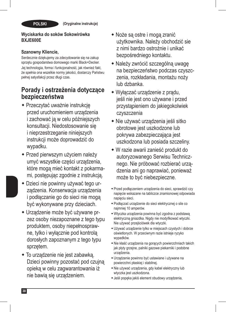 POLSKI (Oryginalne instrukcje) Wyciskarka do soków Sokowirówka BXJE600E Szanowny Kliencie, Serdecznie dziękujemy za zdecydowanie się na zakup sprzętu gospodarstwa domowego marki Black+Decker. Jej technologia, forma i funkcjonalność, jak również fakt, że spełnia ona wszelkie normy jakości, dostarczy Państwu pełnej satysfakcji przez długi czas. Porady i ostrzeżenia dotyczące bezpieczeństwa Przeczytać uważnie instrukcję przed uruchomieniem urządzenia i zachować ją w celu późniejszych konsultacji. Niedostosowanie się i nieprzestrzeganie niniejszych instrukcji może doprowadzić do wypadku. Przed pierwszym użyciem należy umyć wszystkie części urządzenia, które mogą mieć kontakt z pokarmami, postępując zgodnie z instrukcją. Dzieci nie powinny używać tego urządzenia. Konserwacja urządzenia i podłączanie go do sieci nie mogą być wykonywane przy dzieciach. Urządzenie może być używane przez osoby niezapoznane z tego typu produktem, osoby niepełnosprawne, tylko i wyłącznie pod kontrolą dorosłych zapoznanym z tego typu sprzętem. To urządzenie nie jest zabawką. Dzieci powinny pozostać pod czujną opieką w celu zagwarantowania iż nie bawią się urządzeniem.